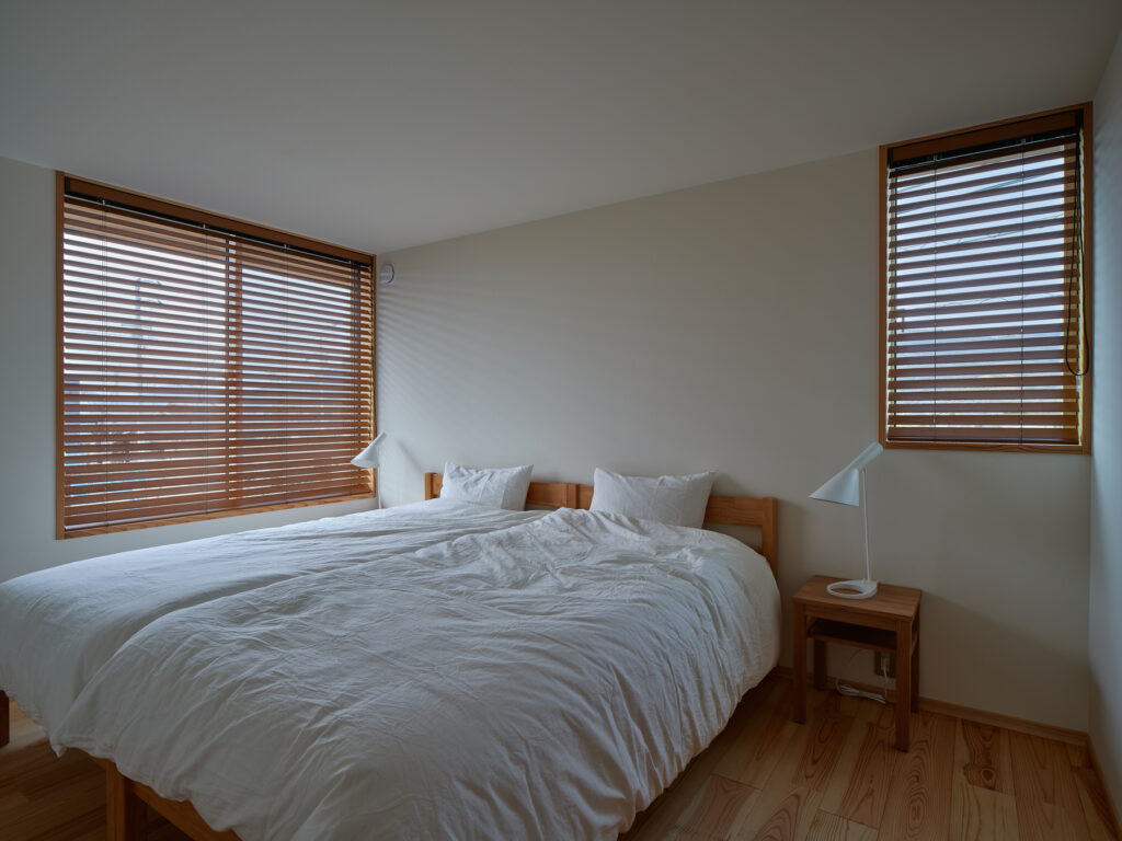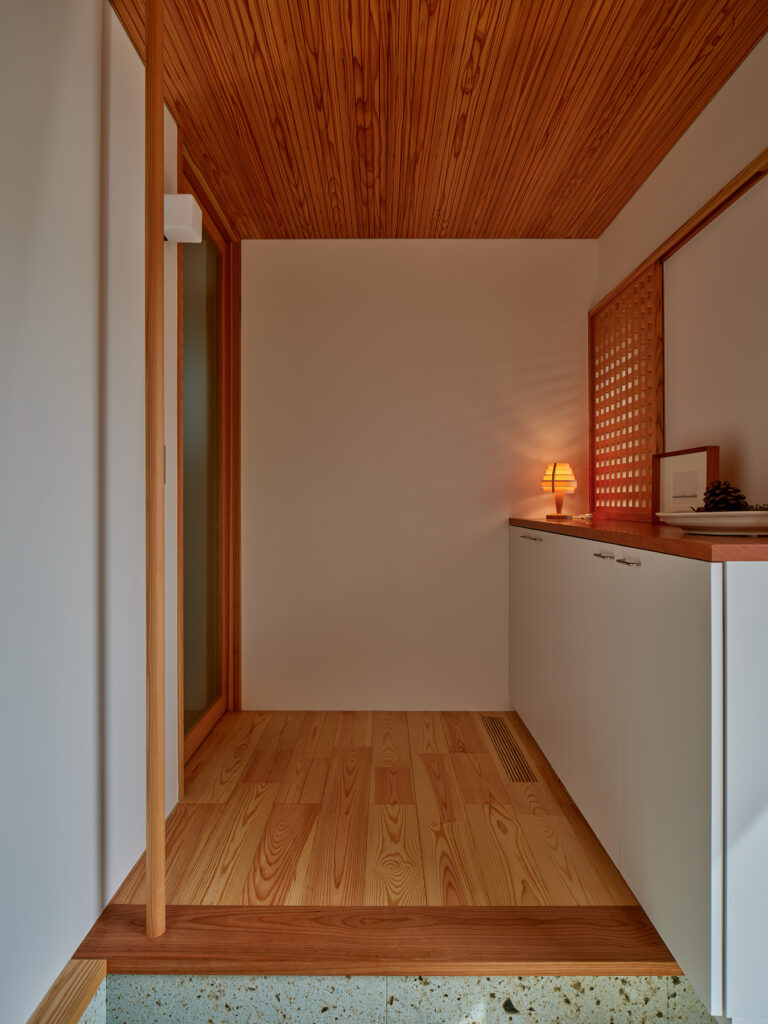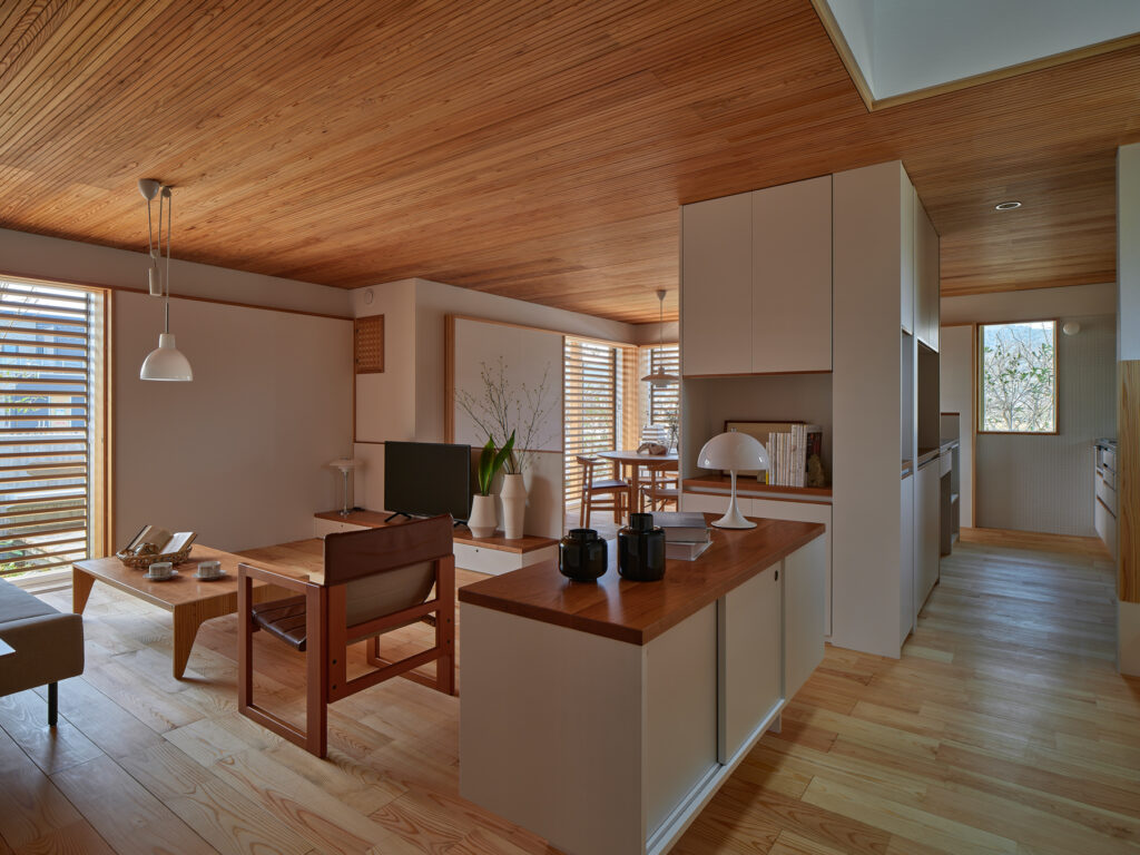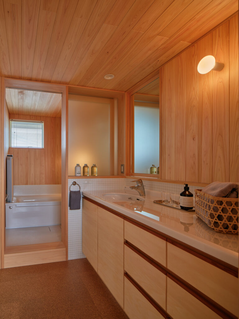 住まいの南は全面窓ではなく、あえて閉じた「たまり」の部分を設けて、上質な落ち着きをもたらしています。キッチンでは、視線の先々に外を眺められる居心地の良さがあり、山の風景に四季を感じられます。周囲をぐるりと回避できるため、家事動線もスムーズです。吹き抜けを通じて、自然光が階下に届き、冷暖房は全館に循環します。