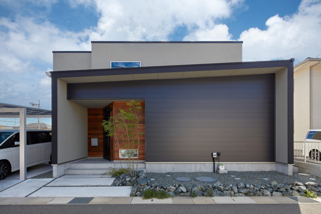 ガルバリウム鋼板、無垢羽目板、塗り壁の3素材をバランスよく組み合わせた外観が特徴です。チーク色に塗装したヒノキ材や斜め配置の玄関ドアが、個性と意匠性を際立たせています。
