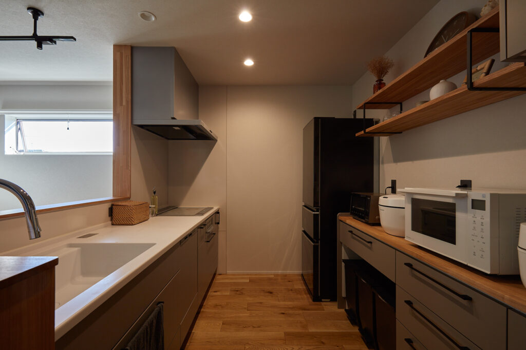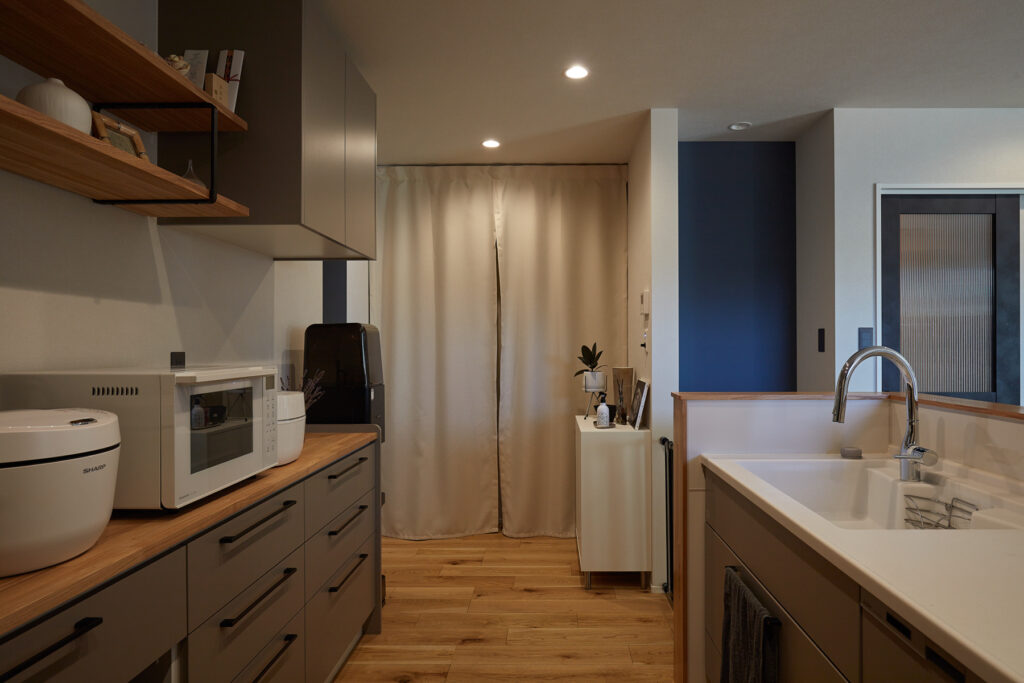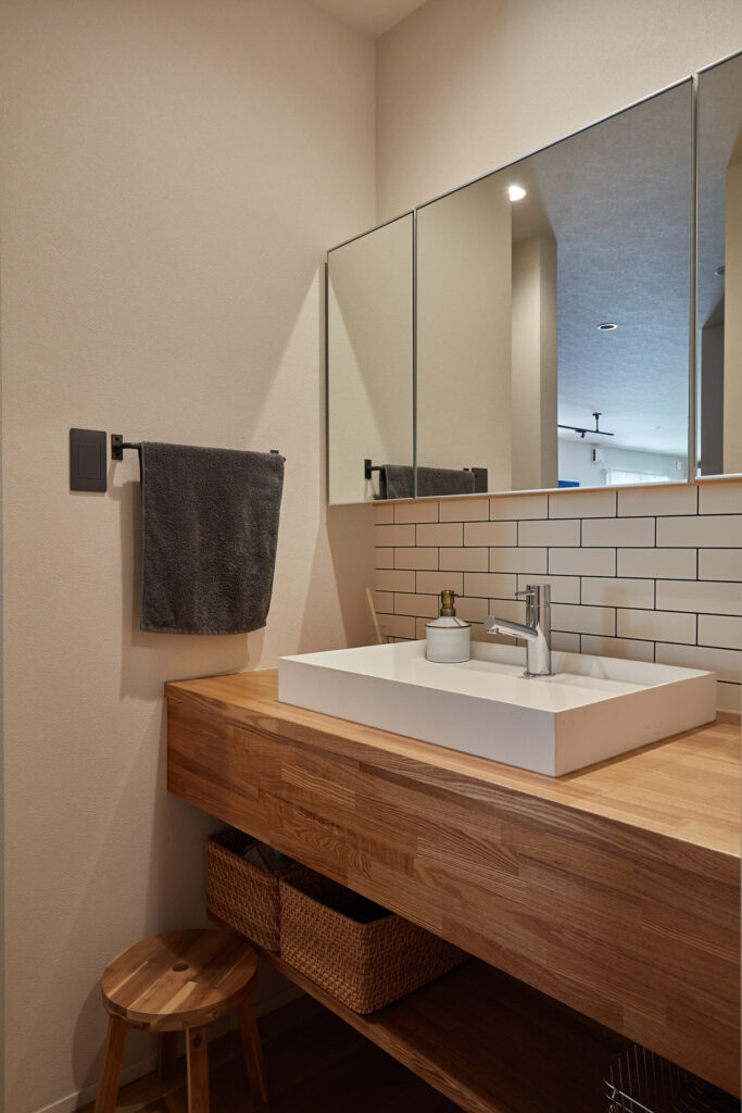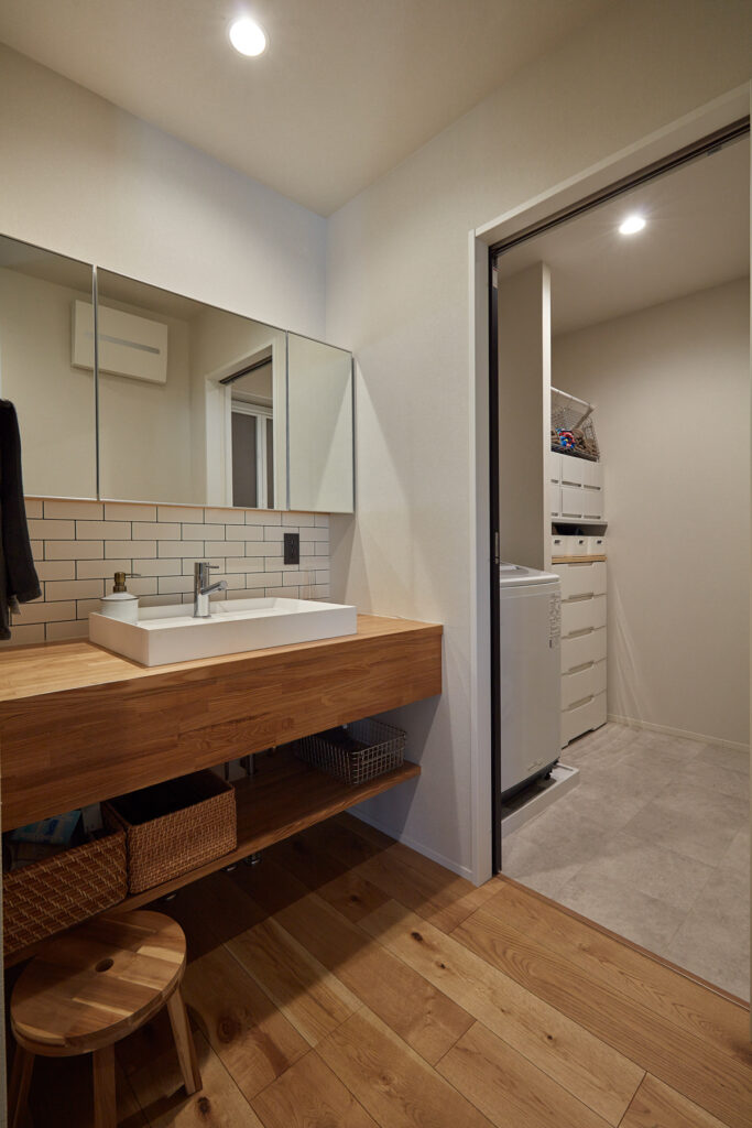 キッチン裏に水回りを集約し、洗面室の隣にサンルームを設置。洗濯やアイロンがけが一度にでき、家事の手問を大幅に軽減します。効率的な動線設計で、共働きのご夫婦にも最適です。