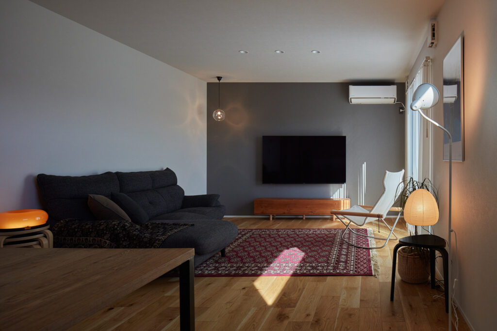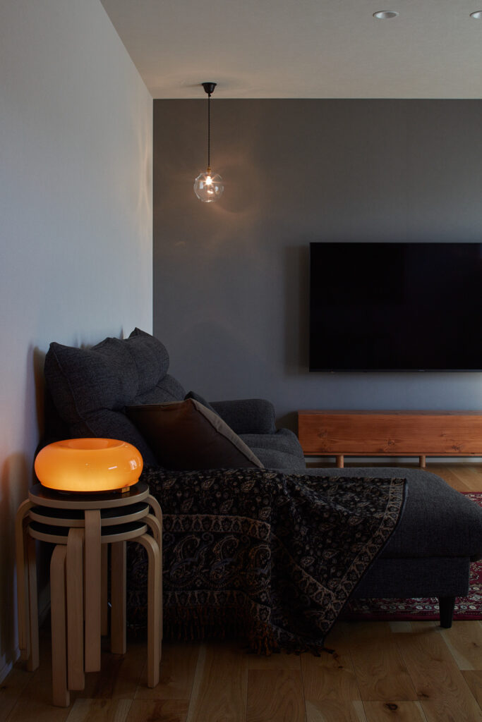 家具と照明が映えるリビングの一角。