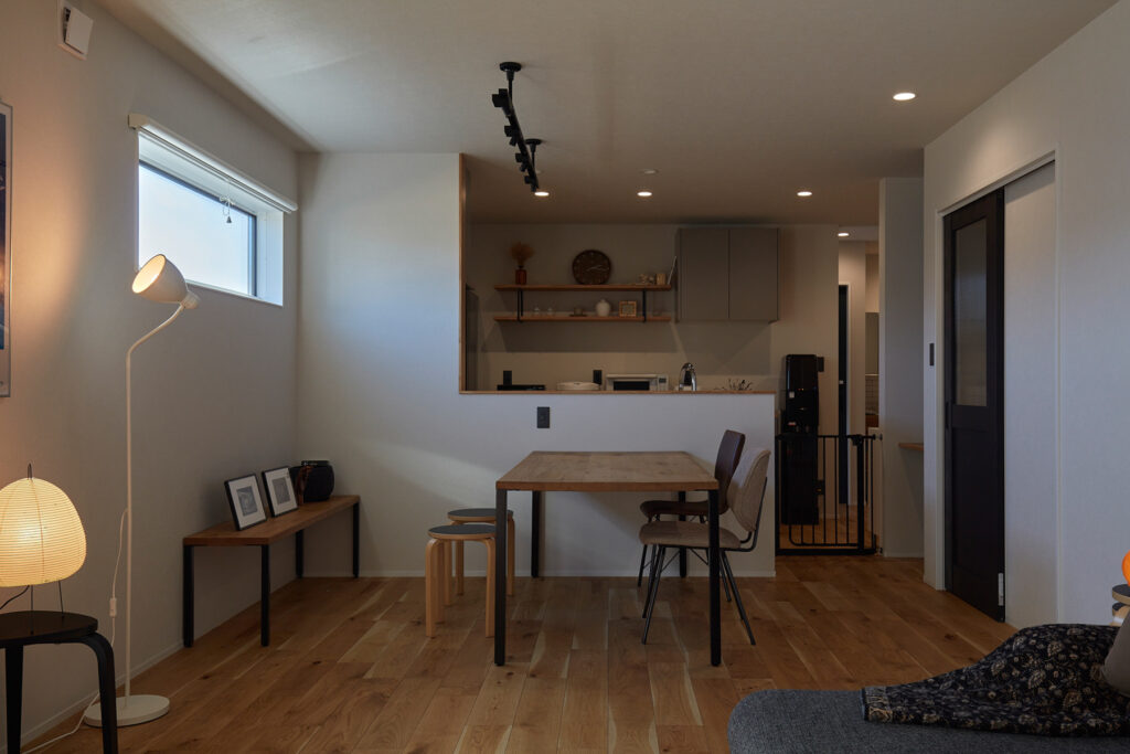 白を基調とした室内に、木製家具や個性的な照明が映えるシンプルモダンな空間。南側の大きな窓から光が差し込み、夕暮れ時にはオレンジ色の明かりが心を安らげます。
