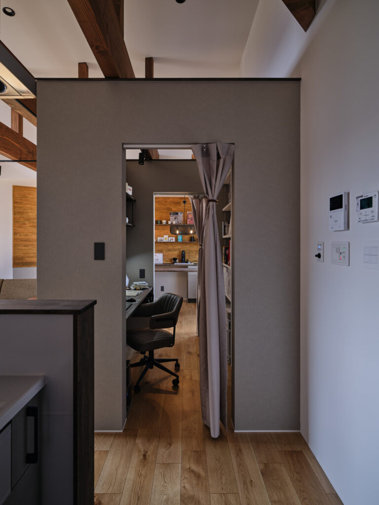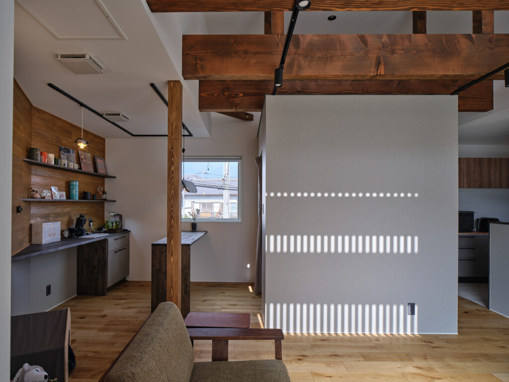 2階に設けたリビングは、造作カフェバーカウンターを中心に、趣味の時間とくつろぎの時間を両立できる空間です。採光とプライバシーを両立する設計で、外からの視線を気にせず、心地よい光に包まれて過ごせます。
