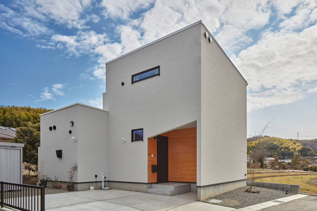 軒を出さずシャープに仕上げた塗り壁の美しい外観。周囲の景色とも調和するシンプルな佇まい。