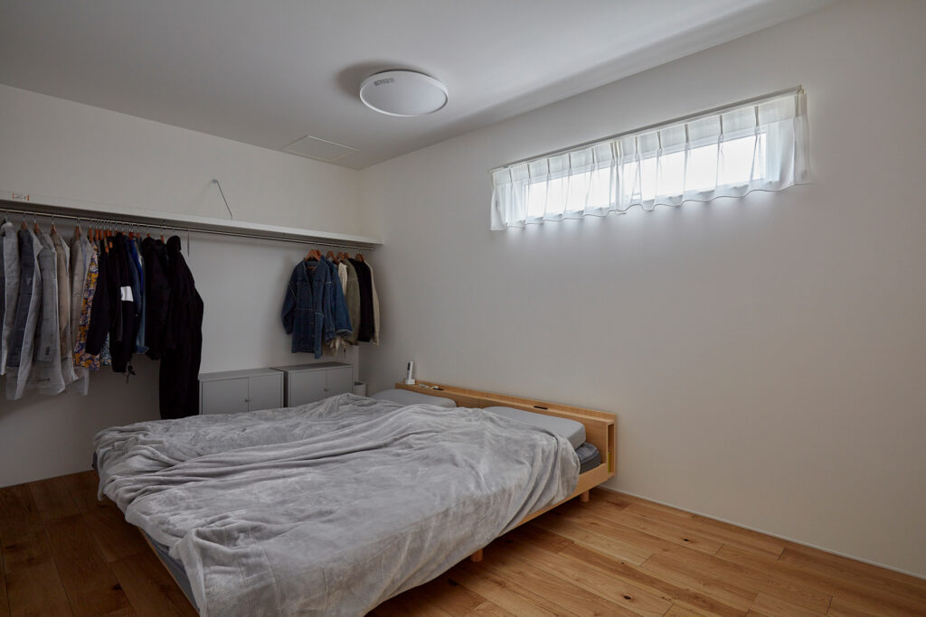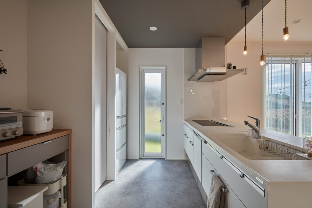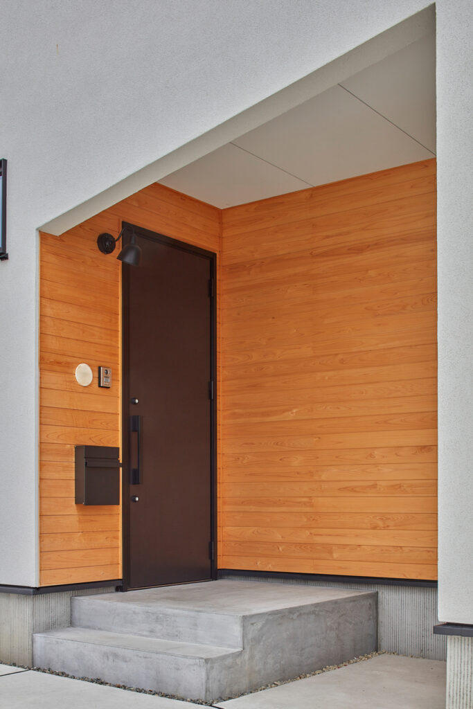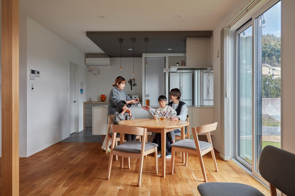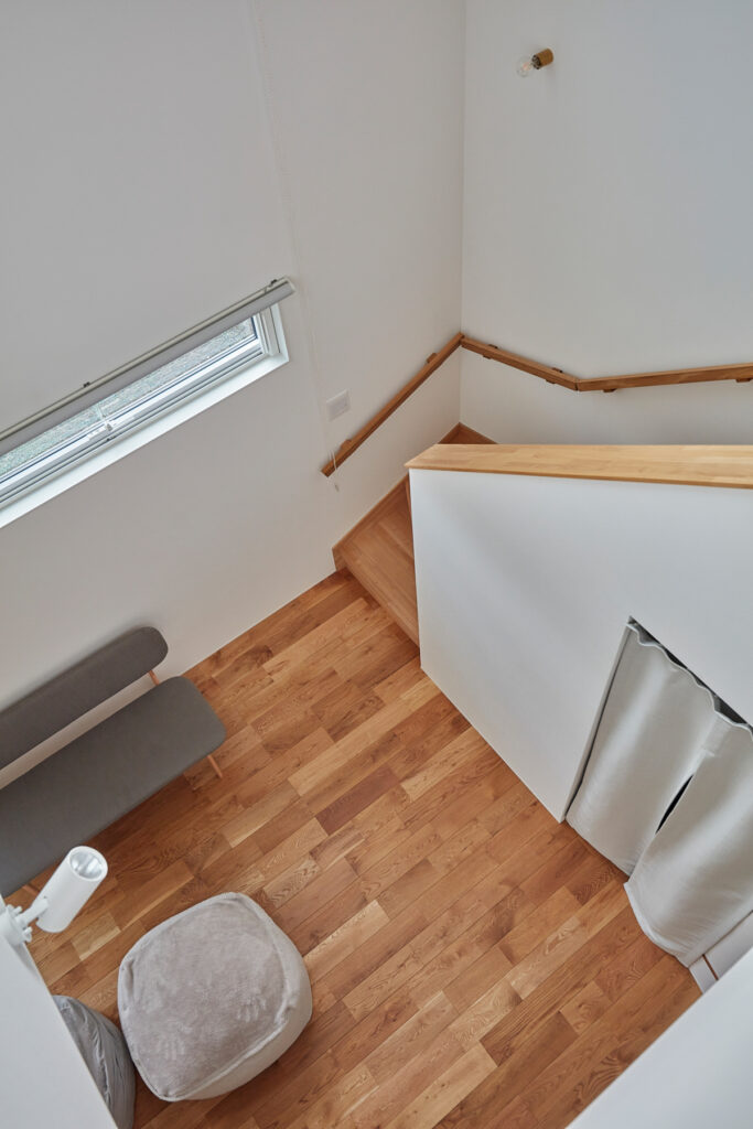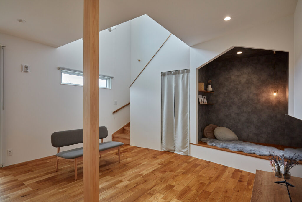 外観は軒を出さず、塗り壁でシャープな印象に仕上げました。LDKの一部に吹き抜けを設け、高低差を生かした立体的な空間が広がります。小上がりヌックは家族のくつろぎやお子さまの遊び場として活躍。現しの柱には家族の成長記録を刻み、日々の変化を楽しめます。暮らしの中に遊び心とあたたかみを感じる住まいです。