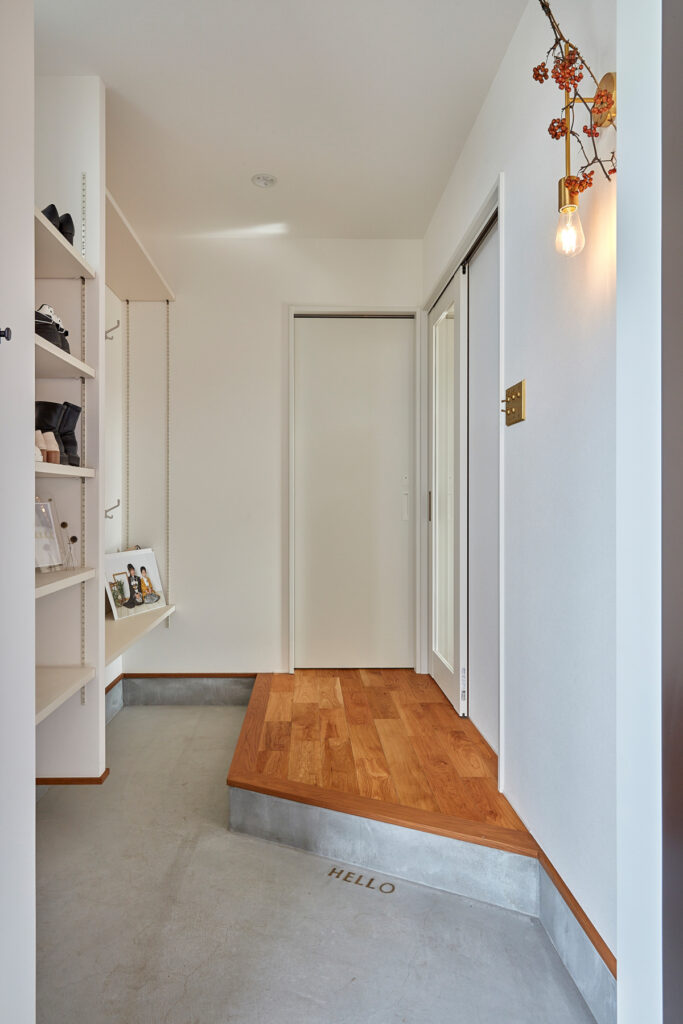 見せる収納と飾り棚で個性と機能性を両立した玄関。家族の靴や小物も美しくディスプレーできます。