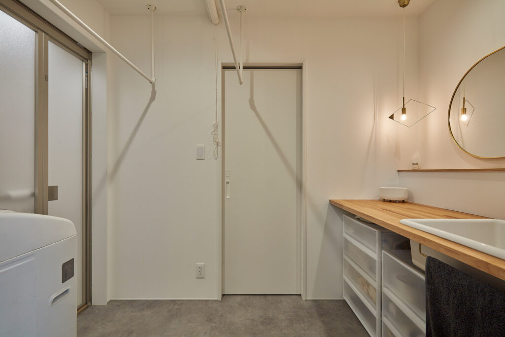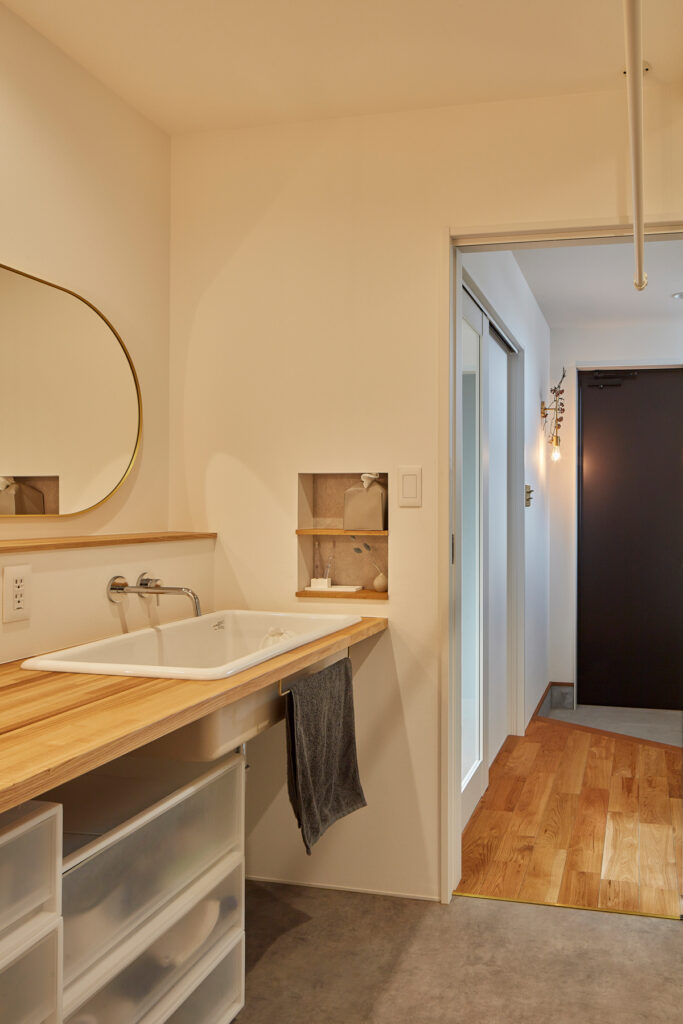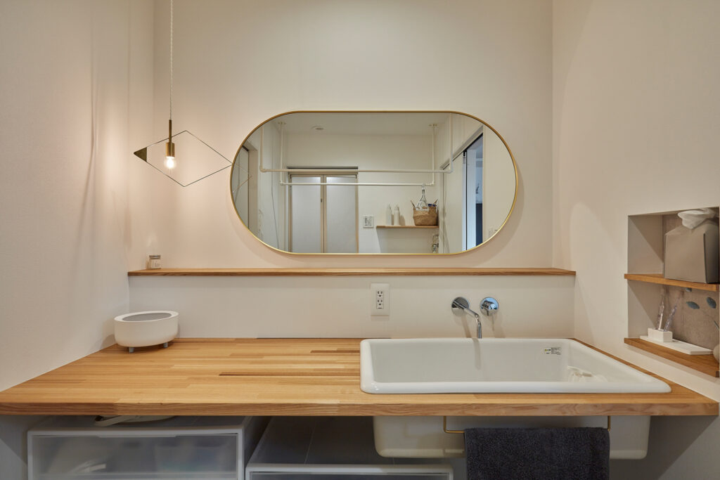 帰宅後すぐ使える洗面室はホテルライクな造作空間。木のカウンターと大きな鏡が印象的です。