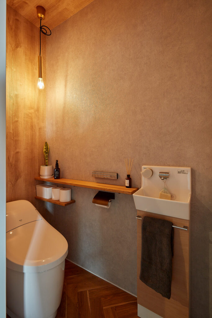 無垢材や真ちゅうなど、自然素材を随所に取り入れたデザインが特徴です。シンプルながらもあたたかみのある空間は、長く住み継ぐほどに味わいが増します。ホテルライクな洗面や、飾り棚のある玄関など、細部までこだわりが感じられる住まい。家族の成長と共に、暮らしの風景が豊かに変化します。
