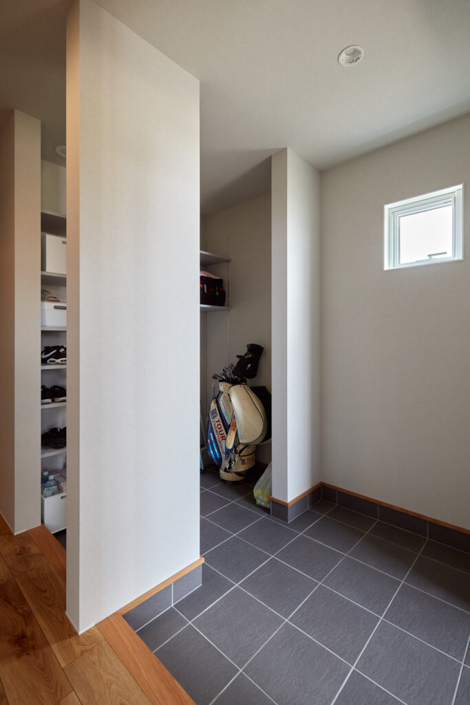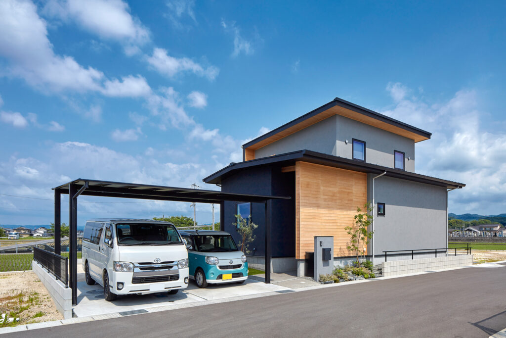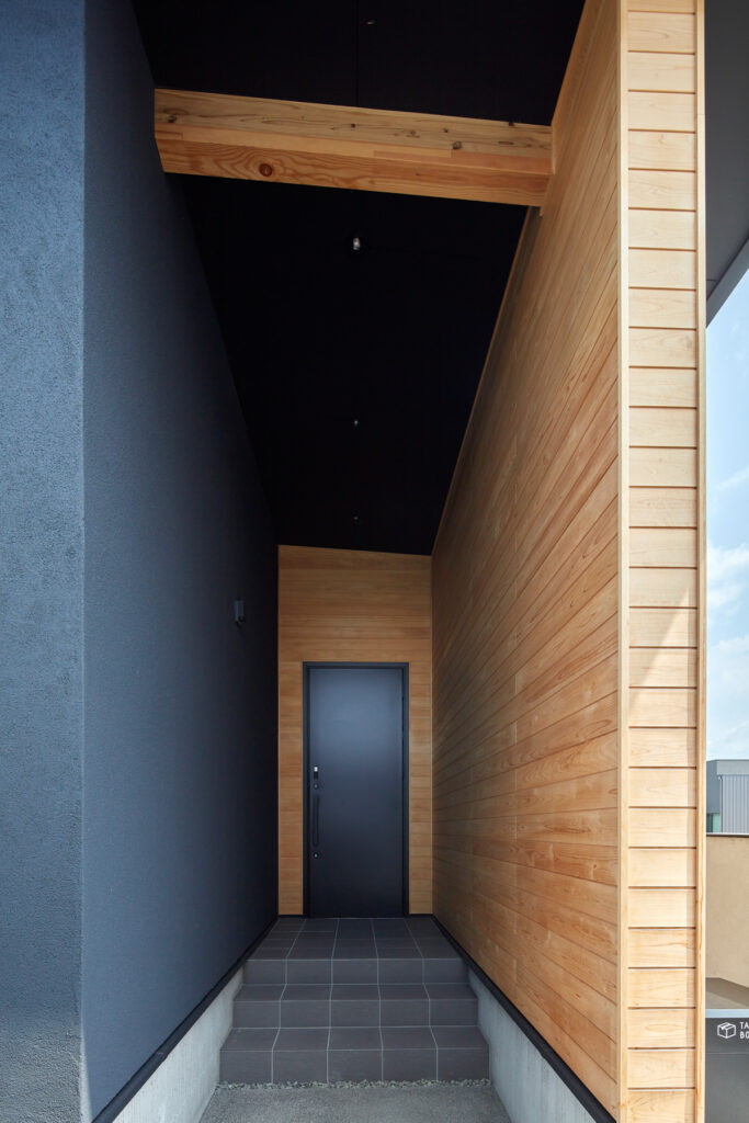 グレーとブラックの2色の塗り壁に、木のはめ板を組み合わせた外観が印象的です。軒を深く出すことで重厚感を演出し、玄関は奥行きを持たせてプライバシーを確保しています。2way動線を採用し、来客と家族の動線を分けることで、日常の使い勝手と安心感を両立しています。