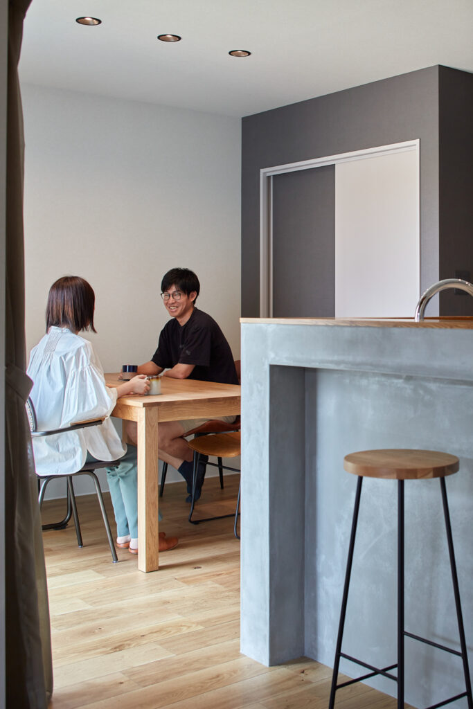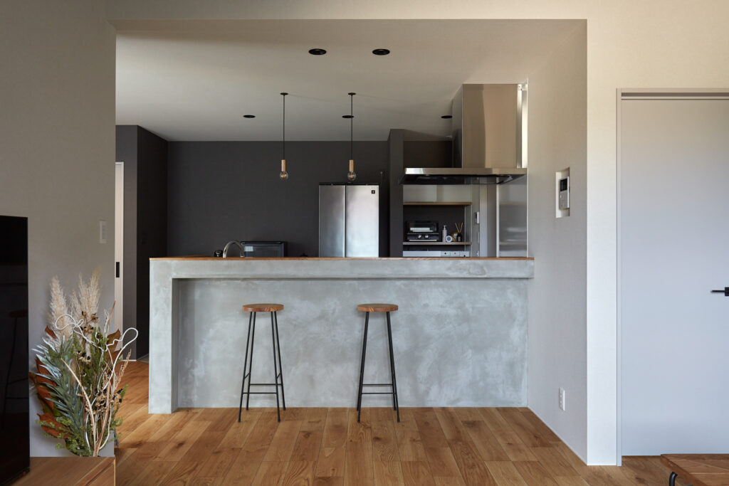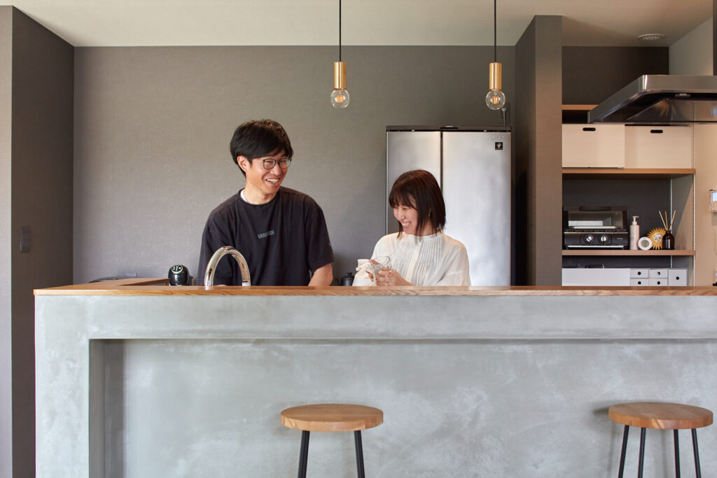 モルタル仕上げのカウンターで夫婦の会話が弾むキッチン。