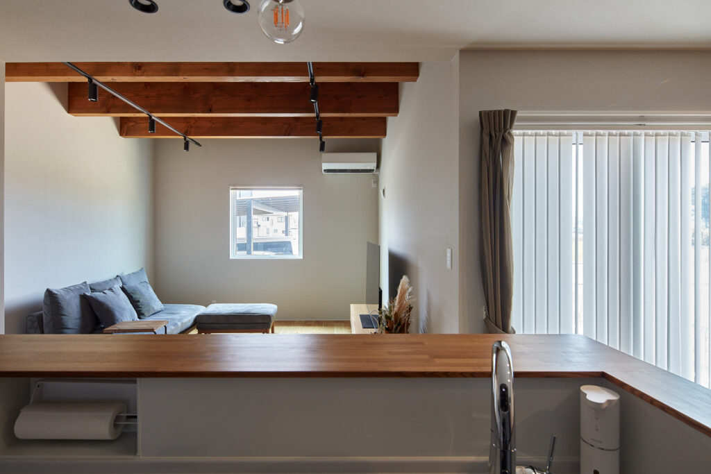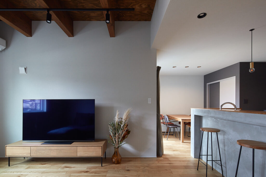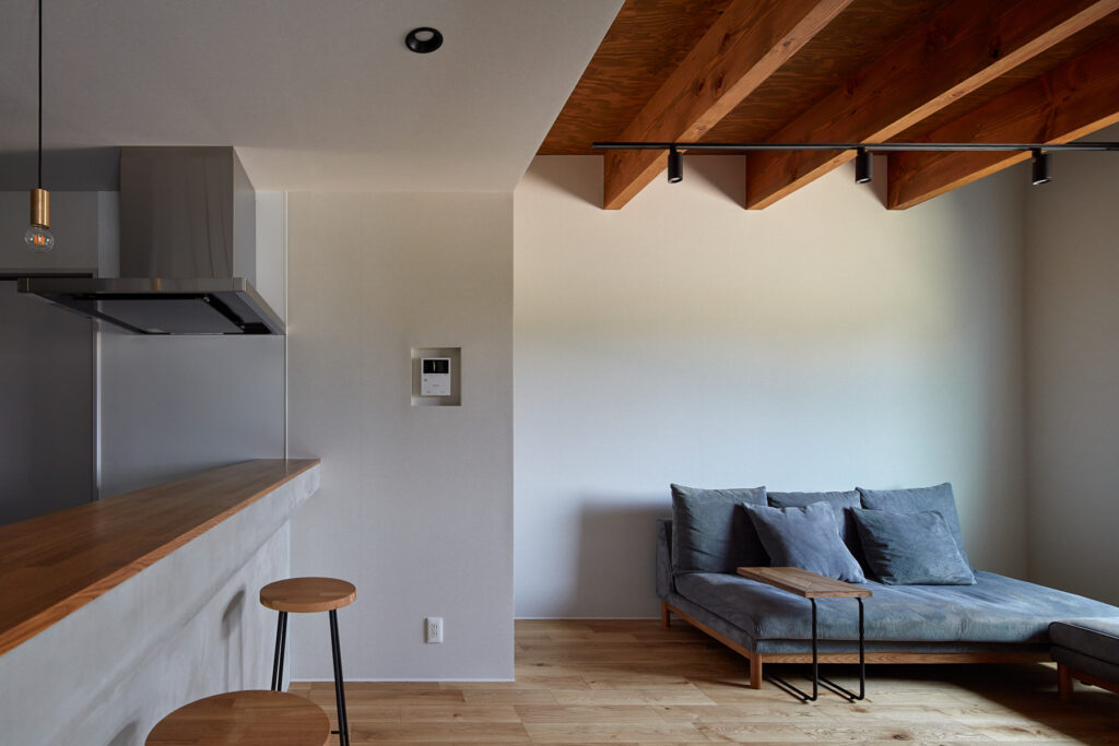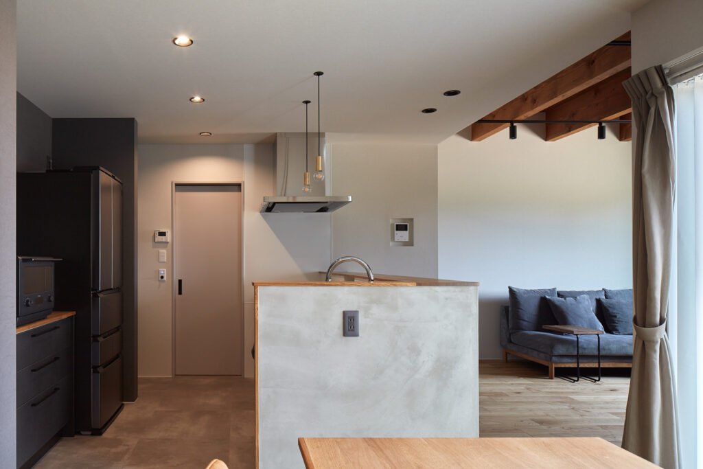 LDKは「くつろぐ」スペースと「食事」スペースを分離。梁現しの天井はウォールナット塗装で落ち着いた雰囲気です。キッチン腰壁はモルタル塗装でまるでバーカウンターのよう。キッチン・洗面・ランドリー・クローゼットはまとめて配置し、家事の負担を軽減します。