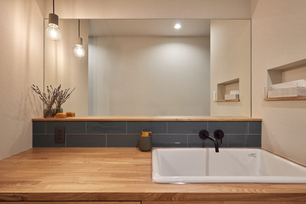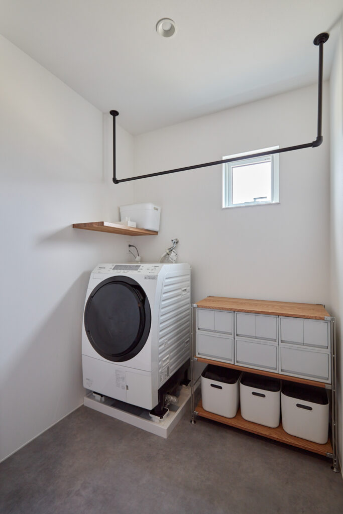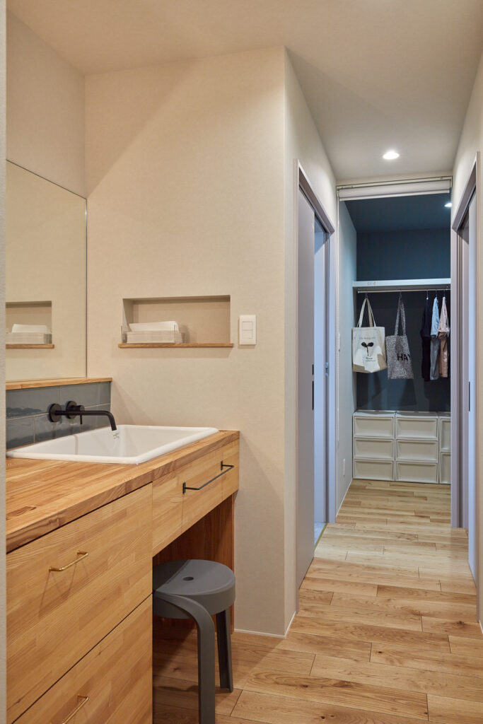 洗面は造り付けで、使い勝手とデザイン性を両立。ランドリールームには天井吊りの物干しバーや収納棚を設け、洗濯から片付けまでをスムーズに。各所に設けた収納が生活感を抑え、将来のライフスタイル変化にも柔軟に対応できる住まいです。