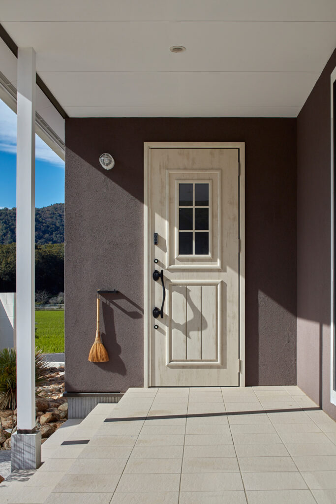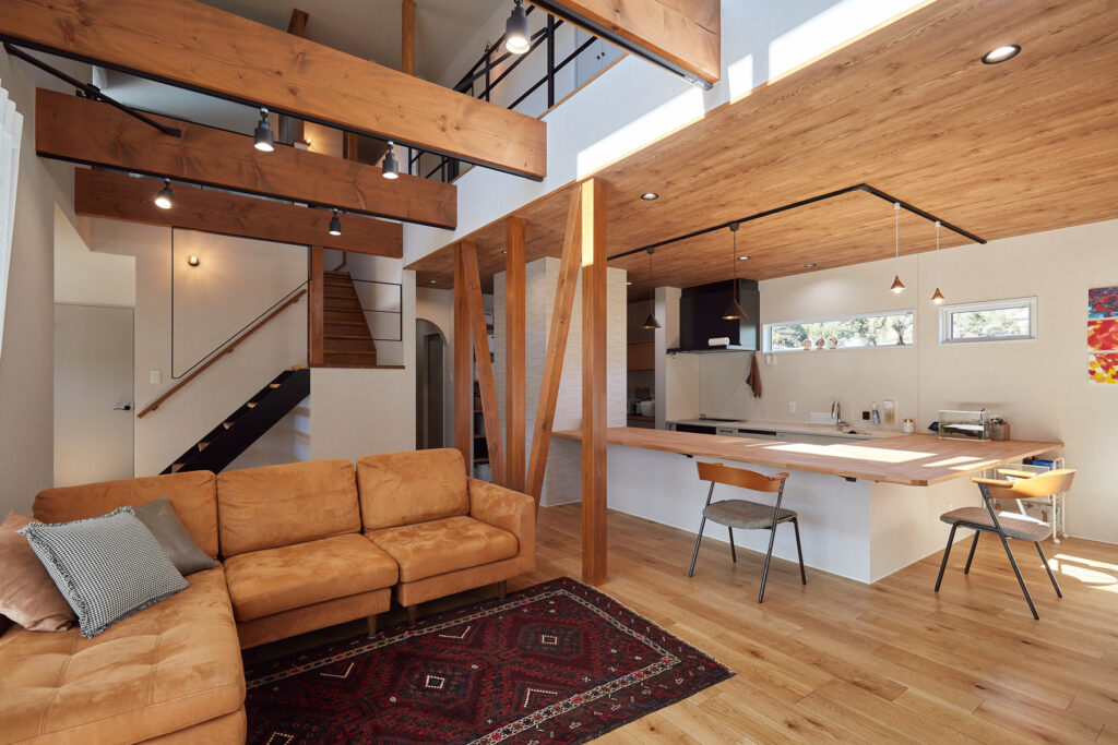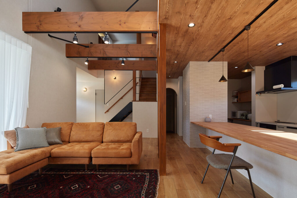 約18帖の吹き抜けリビングは、木材の質感を生かした設計です。梁や天井、床に至るまで自然素材をふんだんに使用し、空間全体にあたたかみが広がります。お気に入りの家具や照明が調和し、家族が自然と柔まる場所に。北側の窓からは外の景色が望め、季節ごとの移ろいを感じながら、日々の暮らしに彩りを添えています。リビングで過ごす時間が、家族の思い出として積み重なっていきます。