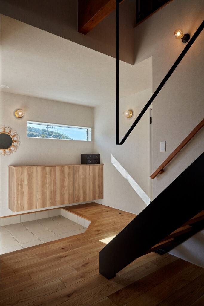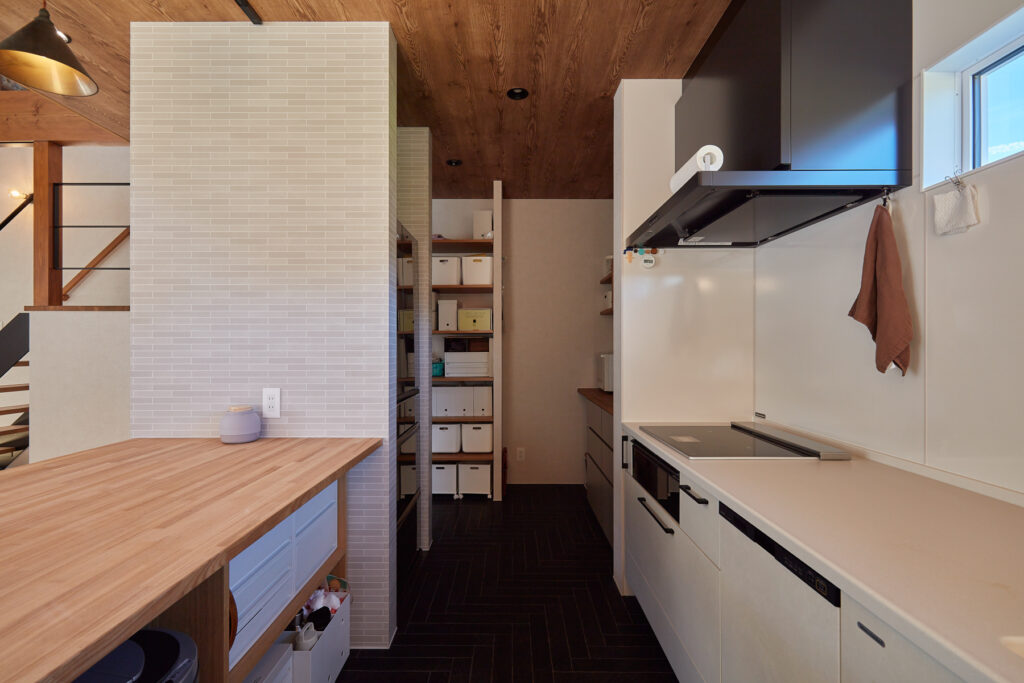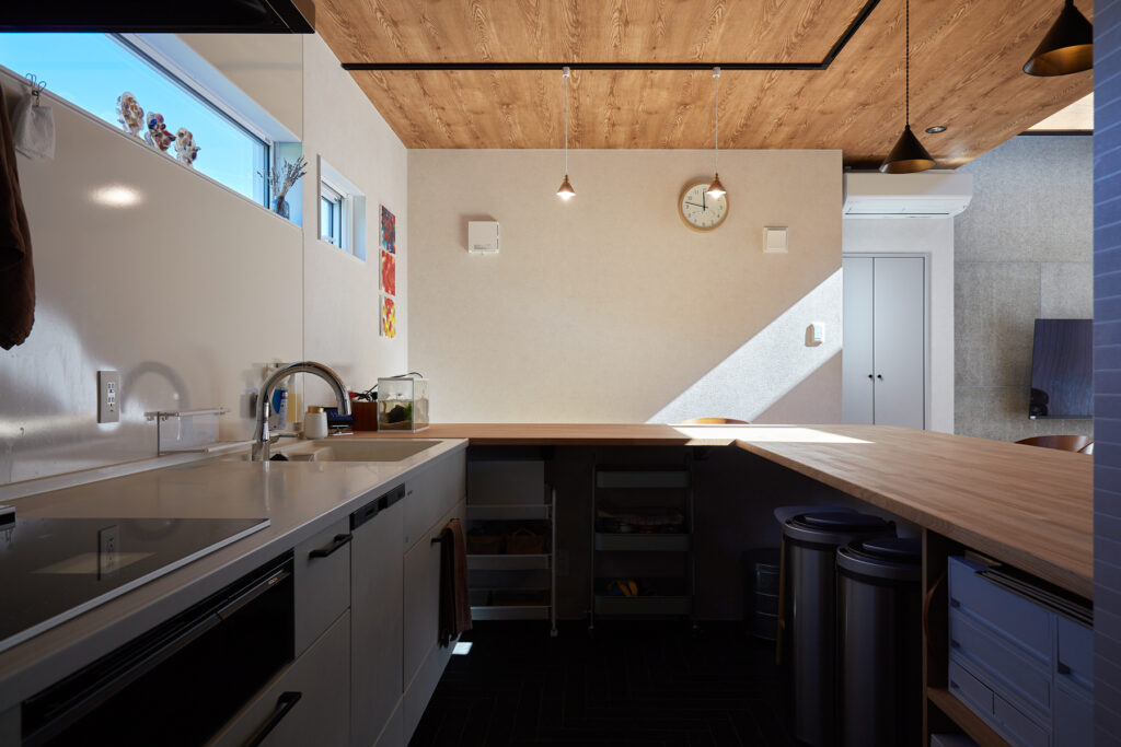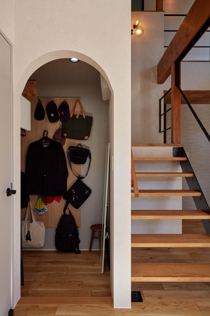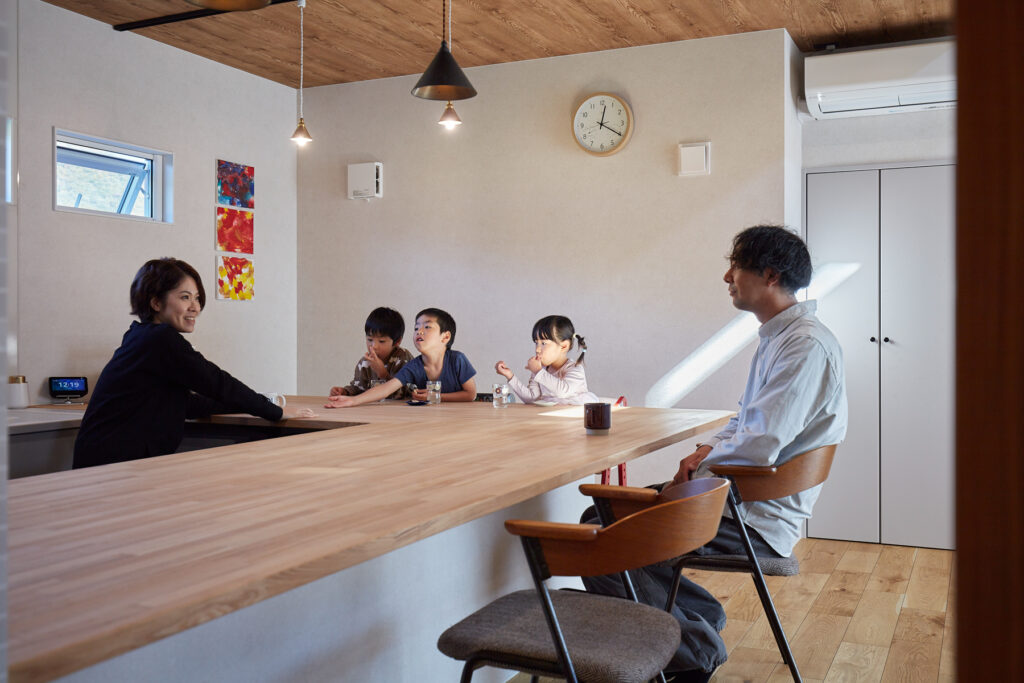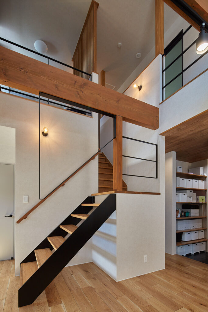 L字型の造作ダイニングテーブルにはタモ材を使用。キッチンの床を一段下げることで、家族と目線が合う高さを実現しています。調理や食事をしながら自然と会話が生まれる工夫です。アイアンと木材を組み合わせたスケルトン階段は、リビングを通って上下階を行き来でき、家族のコミュニケーションが増える設計です。階段の存在が空間のアクセントとなり、日常の動線にも楽しさをプラスしています。