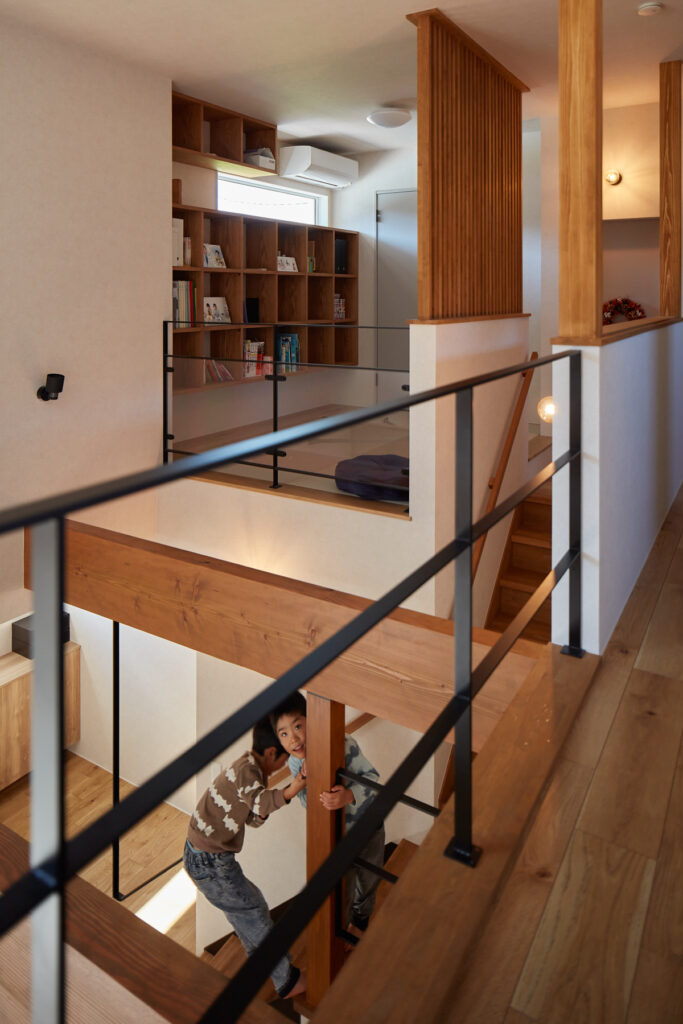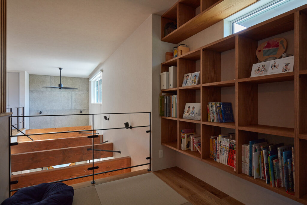 2階には約4帖の畳スペースと本棚を設け、子どもたちの遊び場や読書コーナーとして活用できます。壁の一部を格子にすることで、程よい抜け感とつながりを演出。間仕切りを最小限に抑え、どこにいても家族の存在を感じられる空間です。高い断熟・気密性能により、エアコン1台でも冬を快適に過ごせます。家族の成長とともに、暮らし方も柔軟に変化できる住まいです。