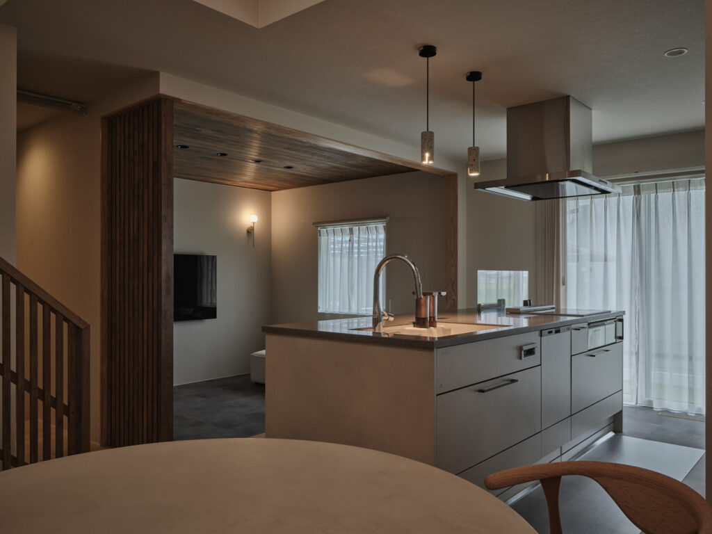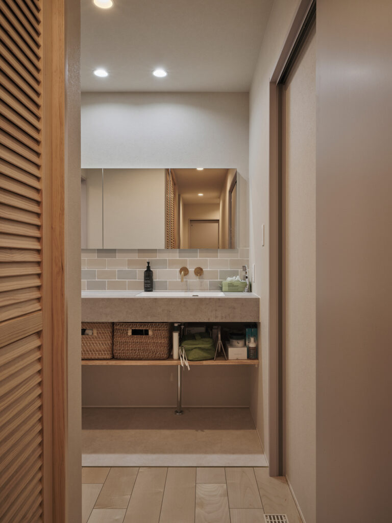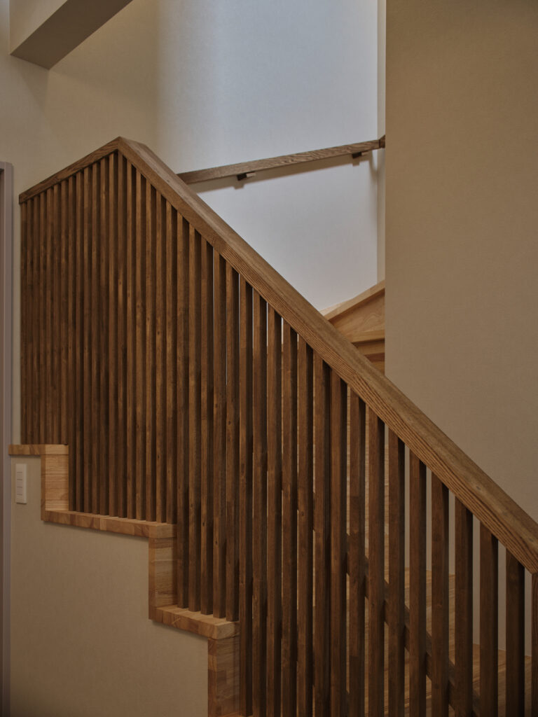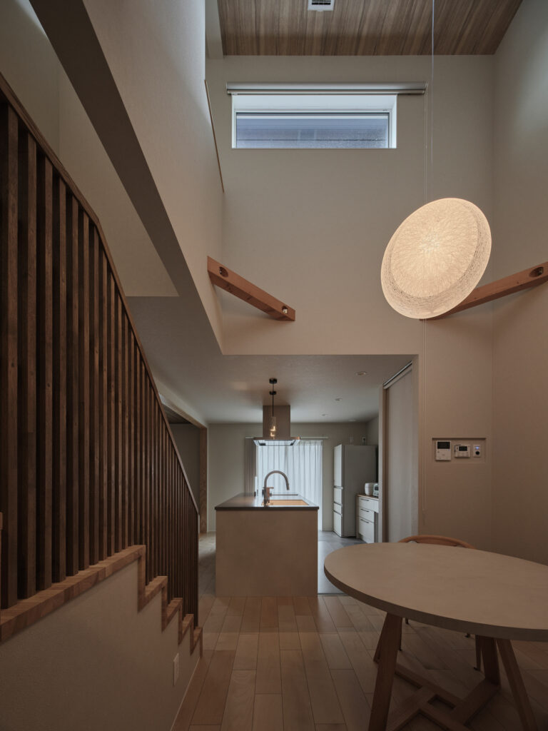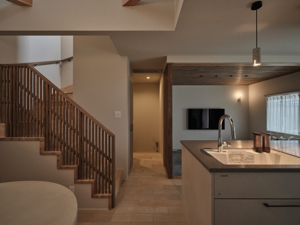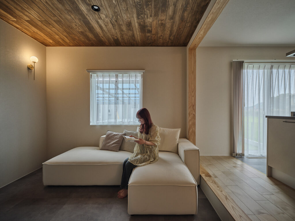 リビングに設けられた段差が、空間に豊かな表情を生み出しています。タイルと木が絶妙に調和した和モダンな雰囲気のなかで、家族が自然に集まる場所となりました。上部には開放的な空間が広がり、視線の抜けが心地よさを演出します。格子で緩やかに仕切ることで、家族の気配を感じながらも、それぞれの居場所が確保されています。