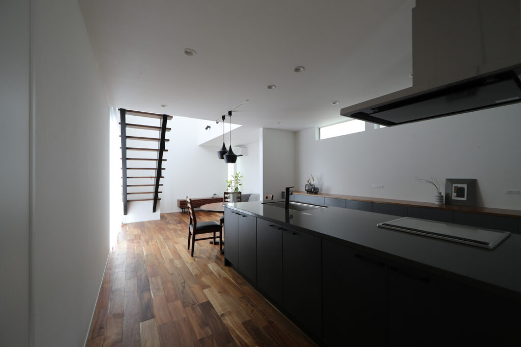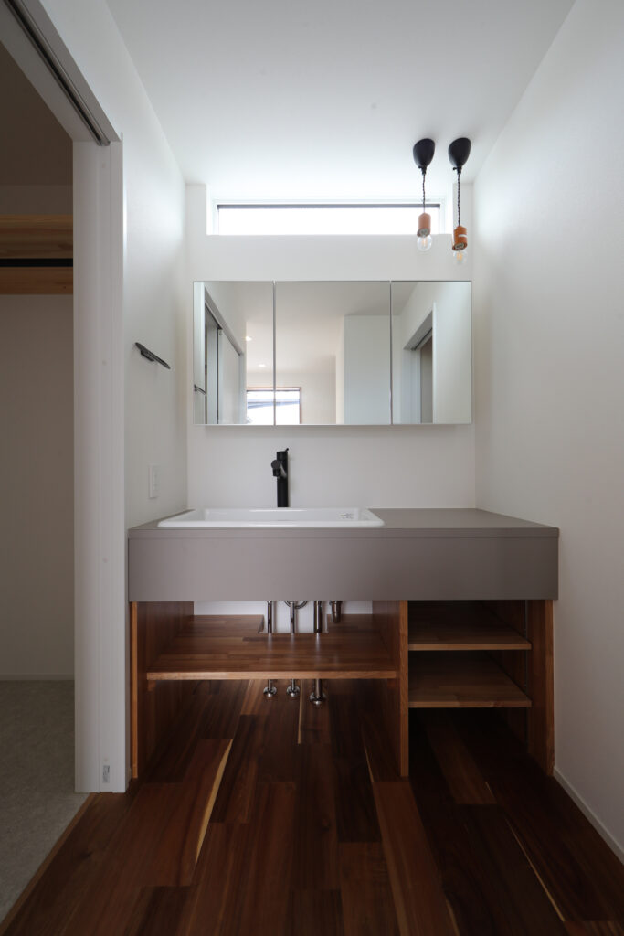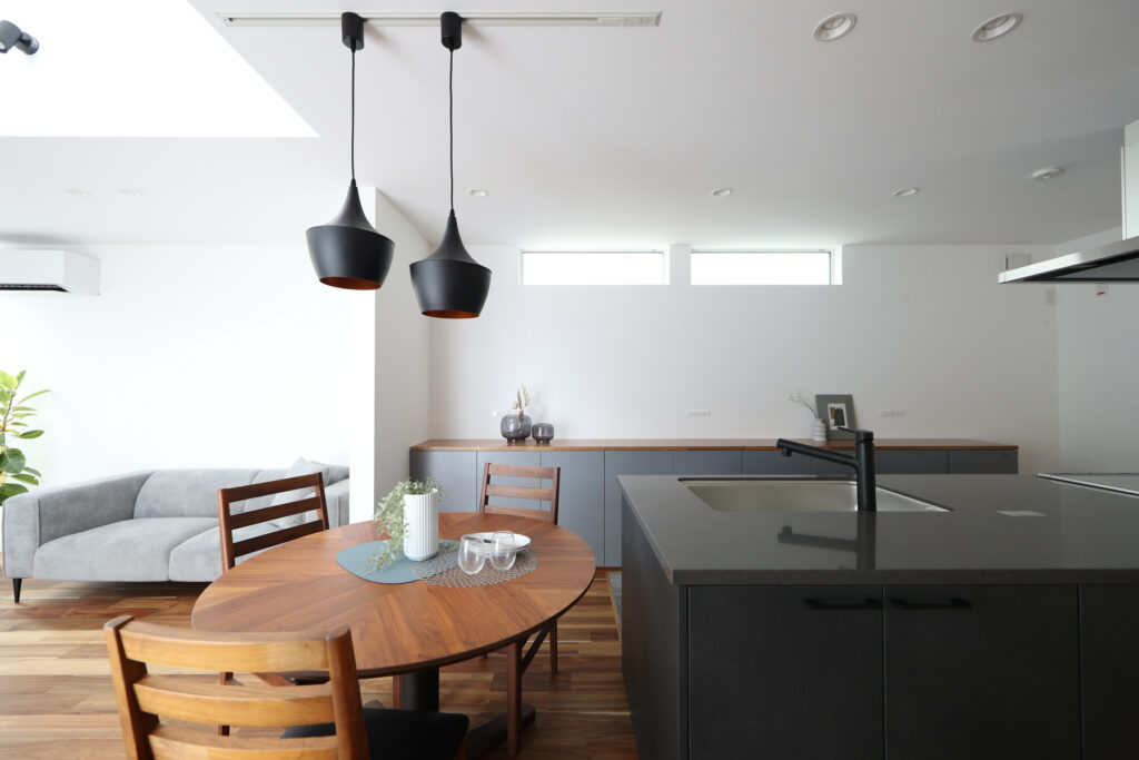 キッチンから洗面・脱衣室、クローゼットまで一直線につながる動線設計により、家事の効率が格段に向上。アイランド型のキッチンカウンターには高級クォーツストーンを採用し、上質な質感と機能美を両立。ダイニングはキッチン横に配置し、食事や片付けもスムーズです。造作洗面台や広い脱衣室など、細部まで使い勝手に配慮しています。