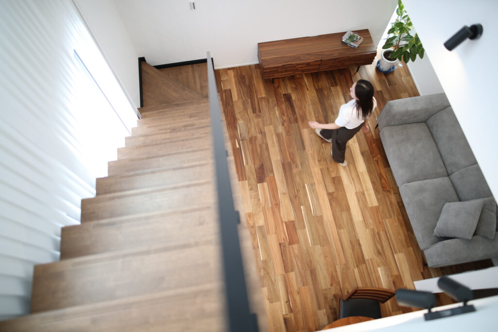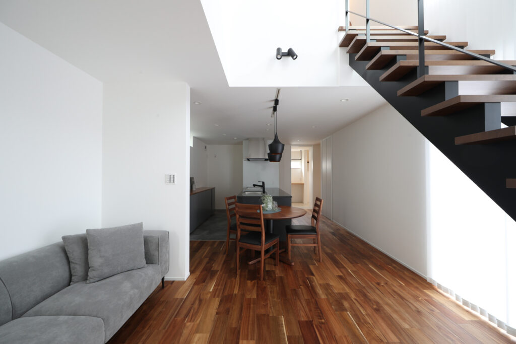 岡山市東区にあるモデルハウスは、高さ5.4mの吹き抜けリビングが1階と2階を緩やかにつなぎ、家族の気配を常に感じられる設計です。アカシア材の床がモノトーンの室内にぬくもりを添え、和やかな団らんの場を演出。プライベートな居場所も2階に確保し、個々の時間も大切にできる住まいです。断熱・気密性能に優れたスーパーウォール工法を採用し、耐震等級3の安心も備えています。