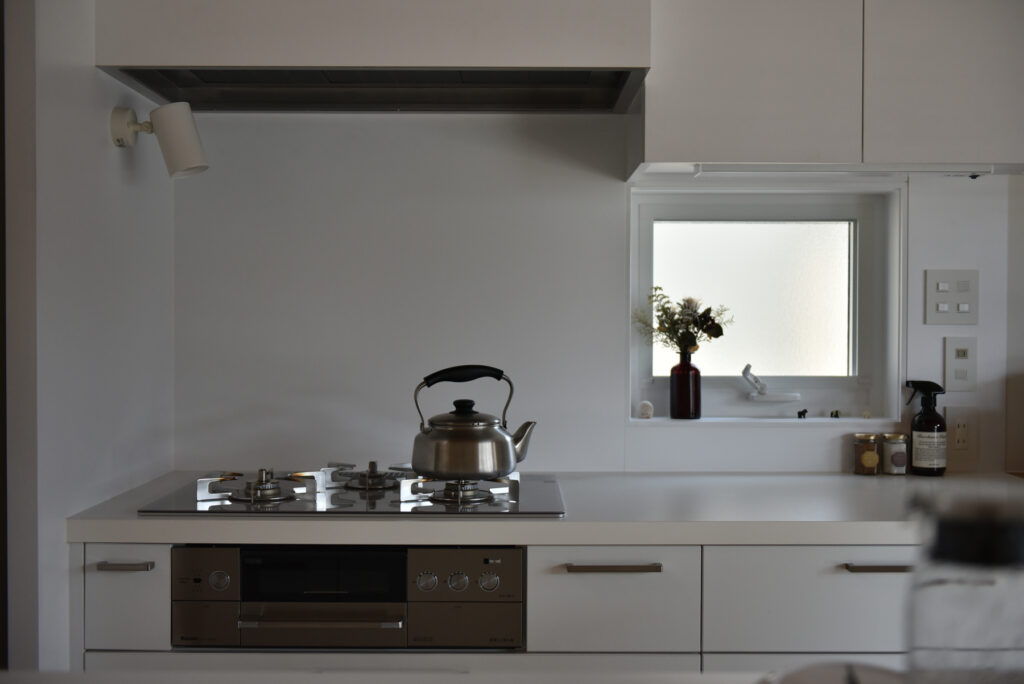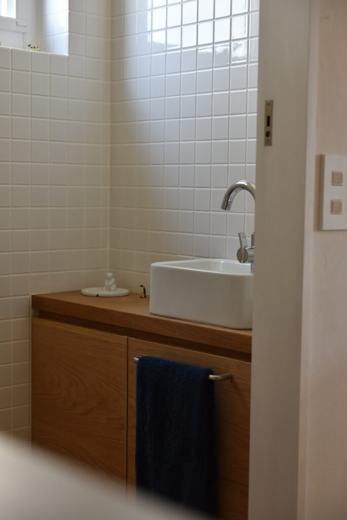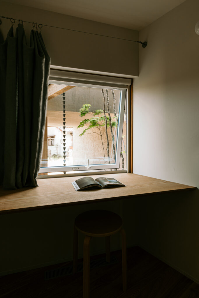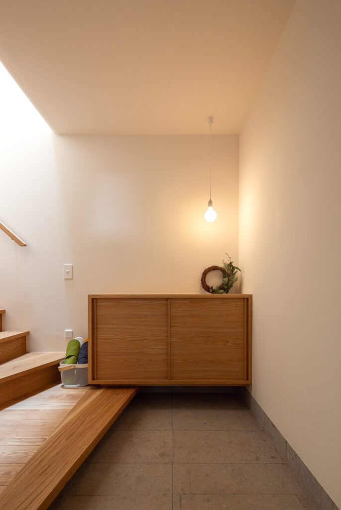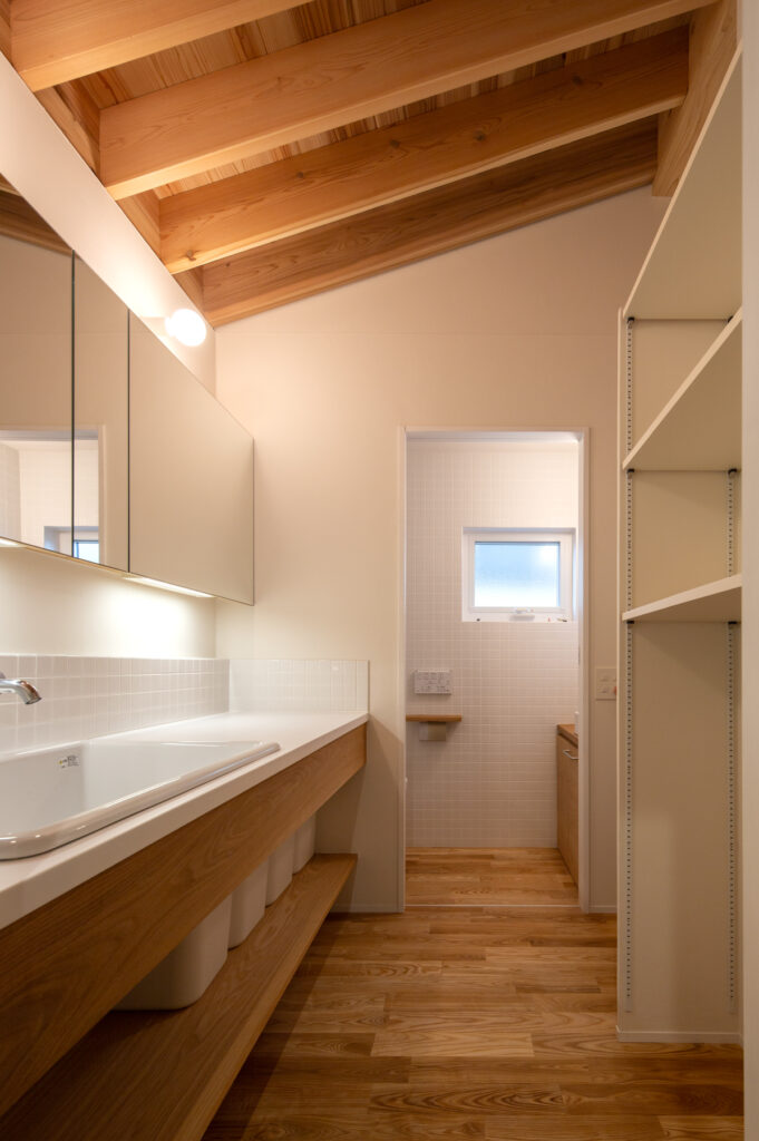 冬の朝、鎖樋を伝って落ちる朝露のかすかな水音が、一日の始まりを告げます。なにげない日常にゆとりを感じられるのは、意匠性だけではなく、機能性も考えられているから。2階の階段裏には洗面・トイレ・WICを集約し、行き止まりをなくし、家事効率を考えられた動線となっています。