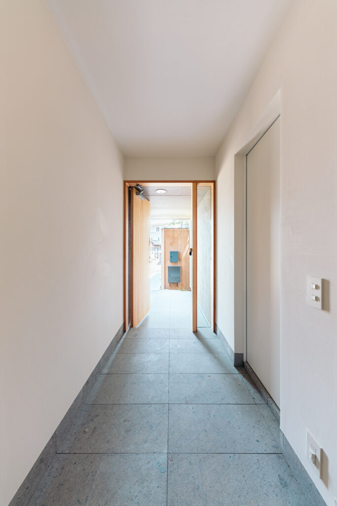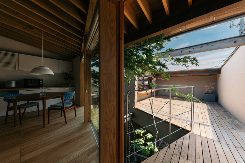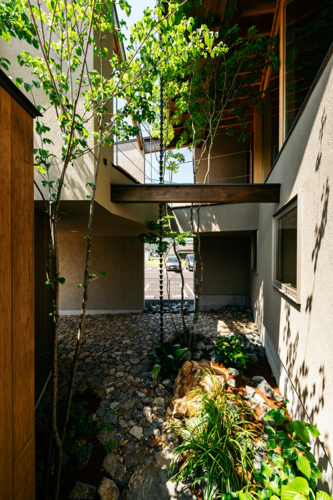 素朴な土色の塗り壁と板塀が、古い家々の残る風景に自然と溶け込んでいます。細いアプローチを抜けた先の玄関は、あえて窓を設けず壁面の質感を主役としました。天窓から落ちるほのかな光が、丸みを帯びた階段の上り口を優しく照らします。ガレージ奥の中庭では、テラス上へ伸びる植栽と2階軒から下がる鎖樋が垂直方向のつながりを生み出し、限られた敷地に立体的な奥行きをもたらしています。