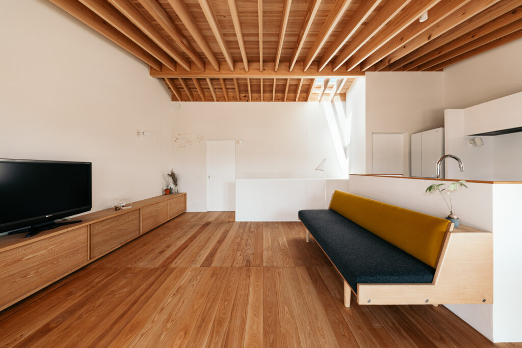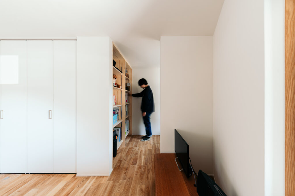 1階は天井高を意図的に下げ、収納扉を壁と一体化させることで水平の広がりを強調しています。