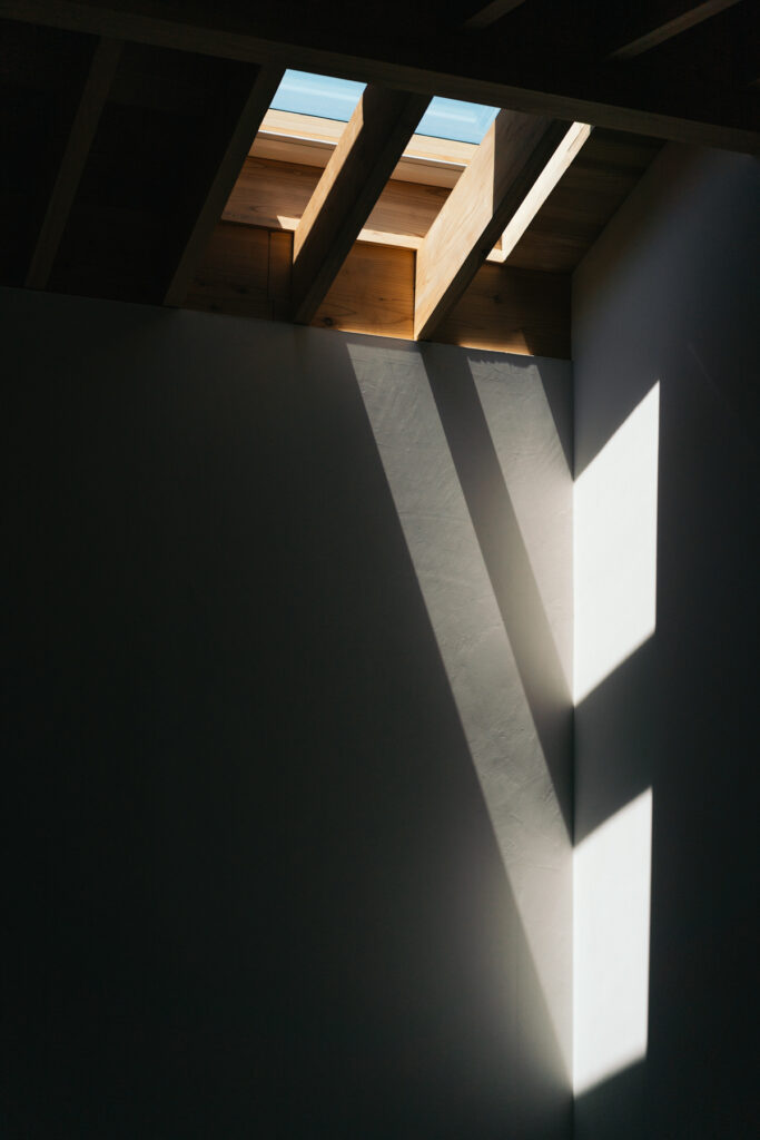 真南へ向けて斜めに設けた開口部は床面から直接ガラスが立ち上がり、2階リビングと広いテラスを視覚的に一体化させています。整然と並ぶ垂木が描く勾配天井は、シンプルな室内に構造の美しさをもたらし、北欧の名作家具を引き立てる背景となりました。対する北面には装飾を一切排した塗り壁が広がり、光と影が刻々と変化する様を静かに映し出します。
