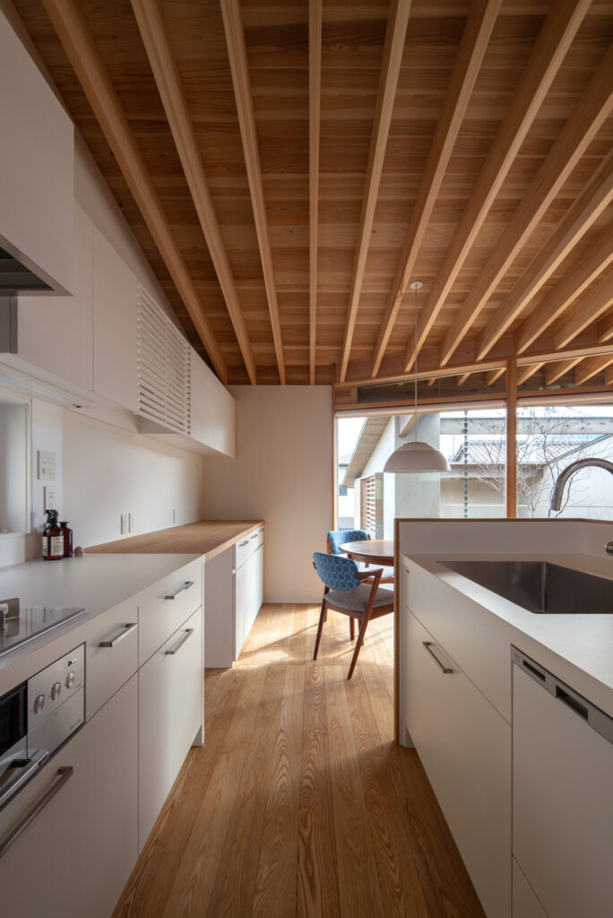 2階階段裏に洗面・トイレ・WICを集約。リビングから抜けてキッチンへ。