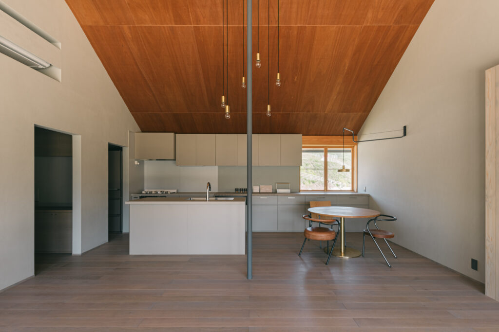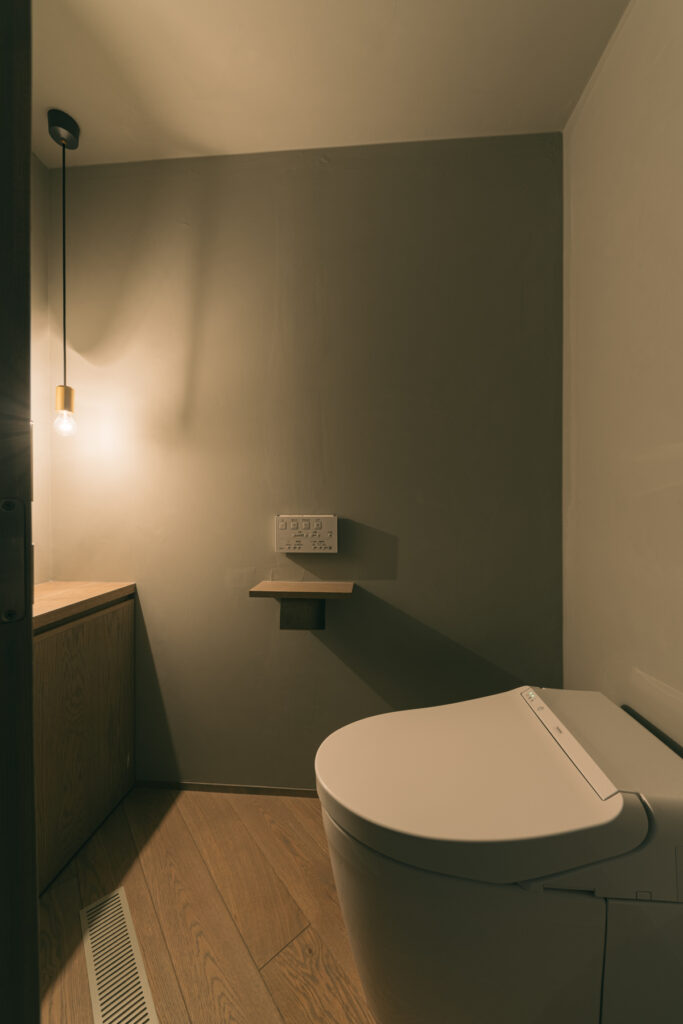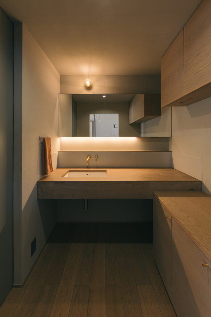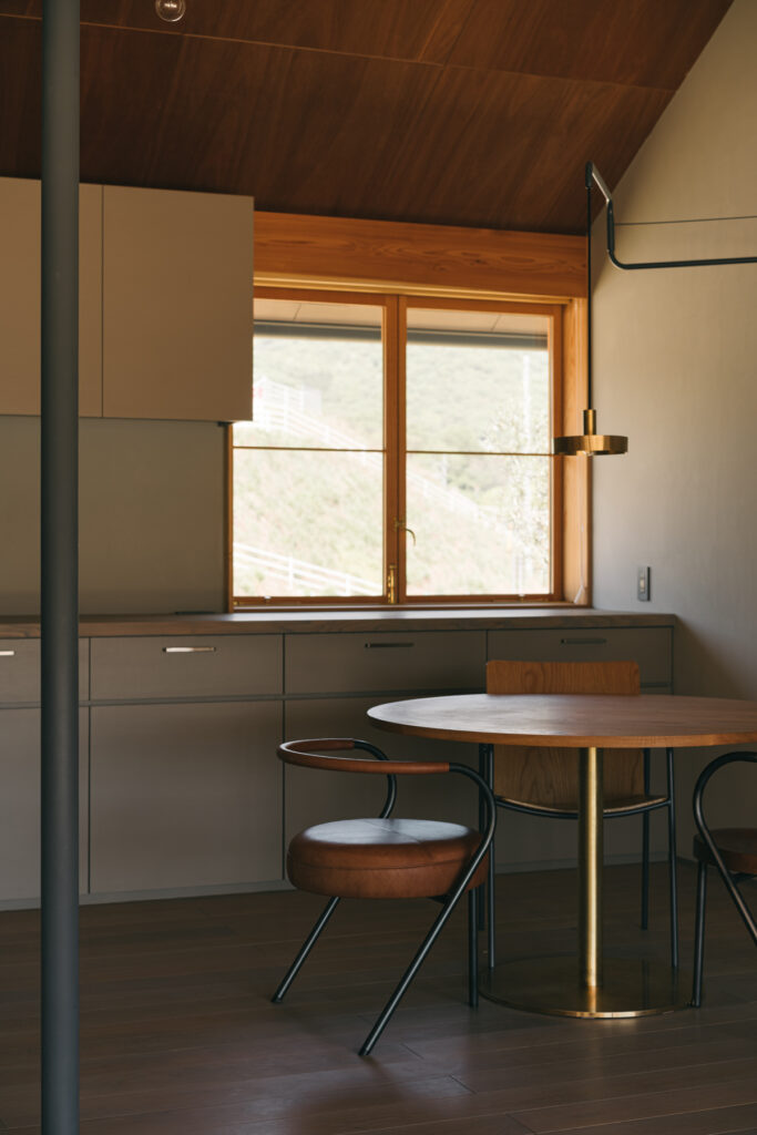 「GRAFTEKT」に合わせた背面収納とレンジフードを造作し、中央柱には「ニューライトポタリー」を環状に配置。ダイニングに柔らかな光を落とす、窓は観音開きの木製サッシと麻の網戸を丁寧に仕立てています。独立洗面は「モールテックス」天板と真ちゅう水栓で端正に。素材一つ一つを丁寧に選び、空間全体に統一した美しさと奥行きをもたせています。
