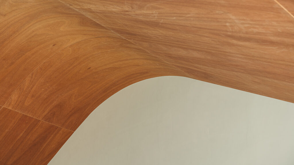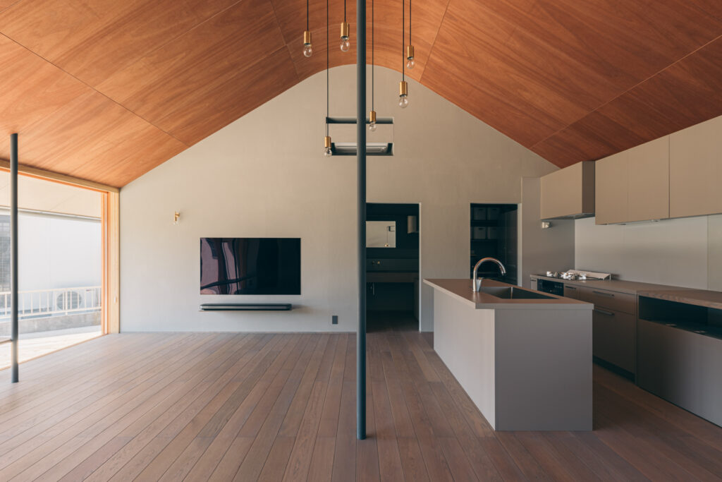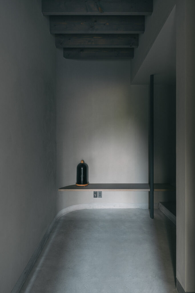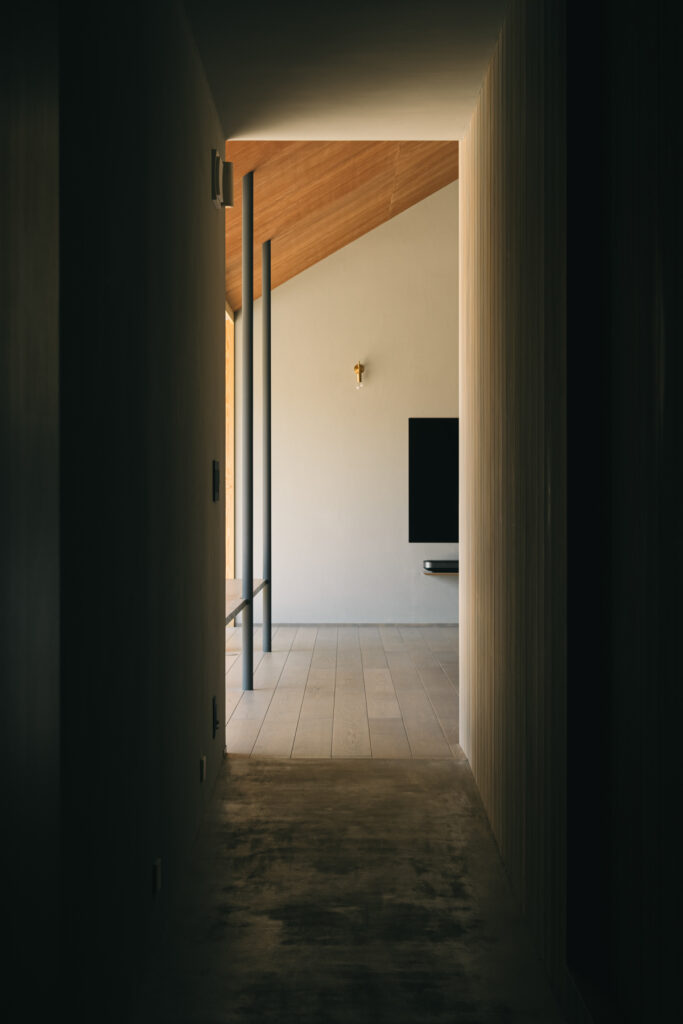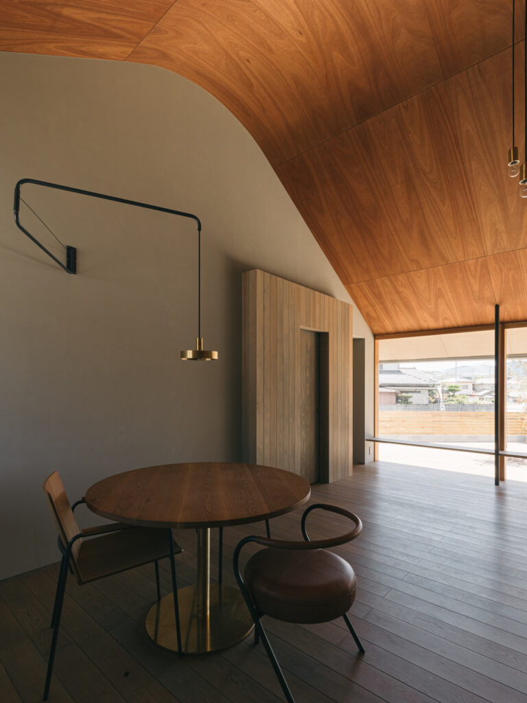接道側にサロン、裏手に住宅を配した「ヘ」の店舗併用住宅です。店舗は前庭へ大きく開き、緑を抱き、訪れる人を迎え入れてくれます。住居側は道路に閉じ、板壁の先に暗がりの廊下を伸ばし、抜けた先でLDKが一気に広がる、住と職にメリハリを付けたプランです。アール天井やリネン張り建具など、質感を重ねて陰影を設えました。