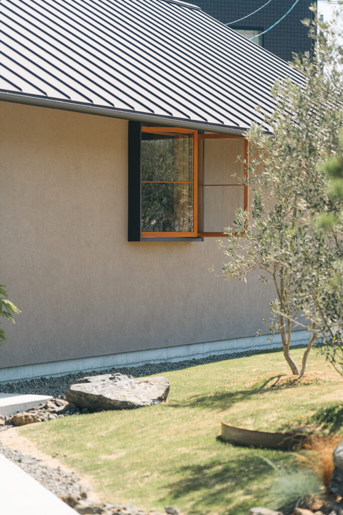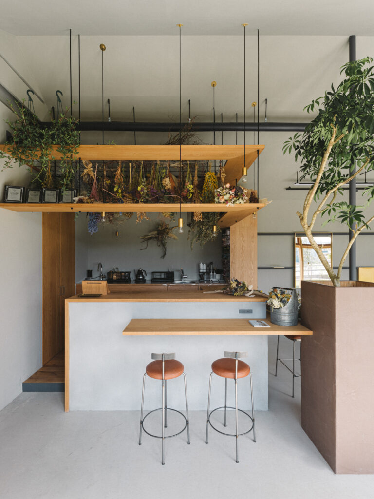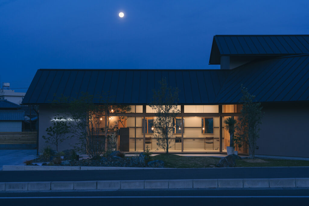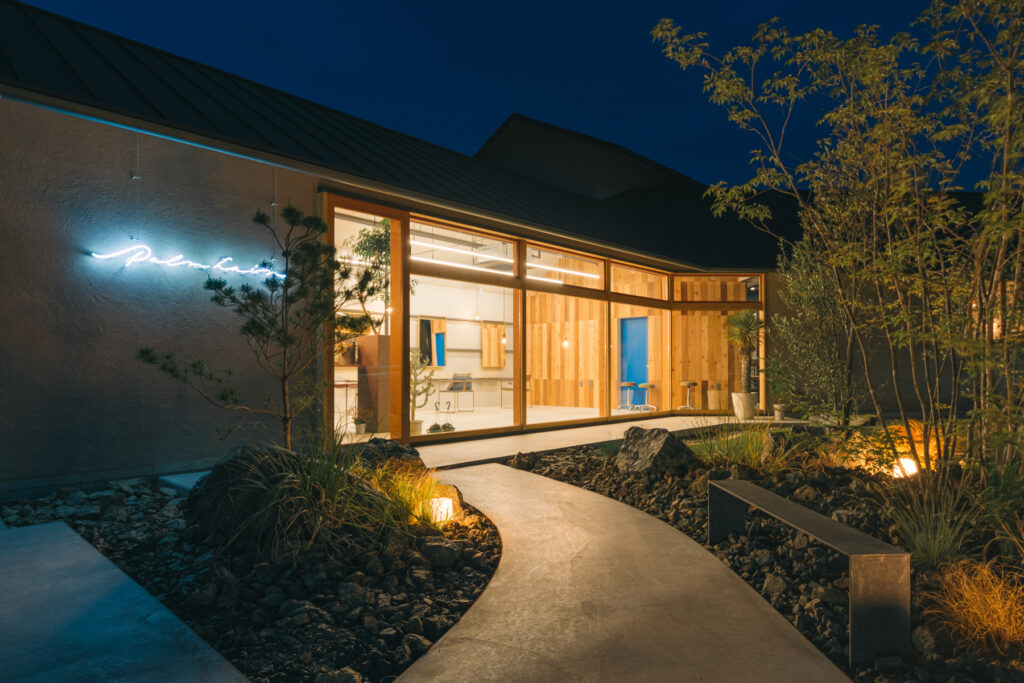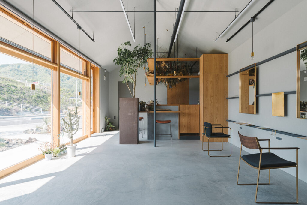 地元の人気ヘアサロン「Palm hair」を新築移転。ガラス張りの店内はすっきりと開放的な空間に、ラフな質感の板壁とブルーのドアがアクセント。サロン受付はたくさんのドライフラワーをつるし、カフェバーのようなカウンターに。外観はコンクリート床を庭先まで延ばし、ドライガーデンと連続。ネオン看板が塗り壁のテクスチャーを際立たせています。