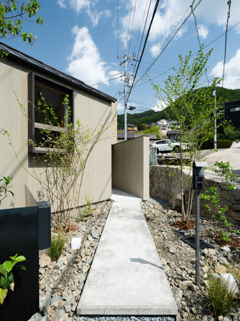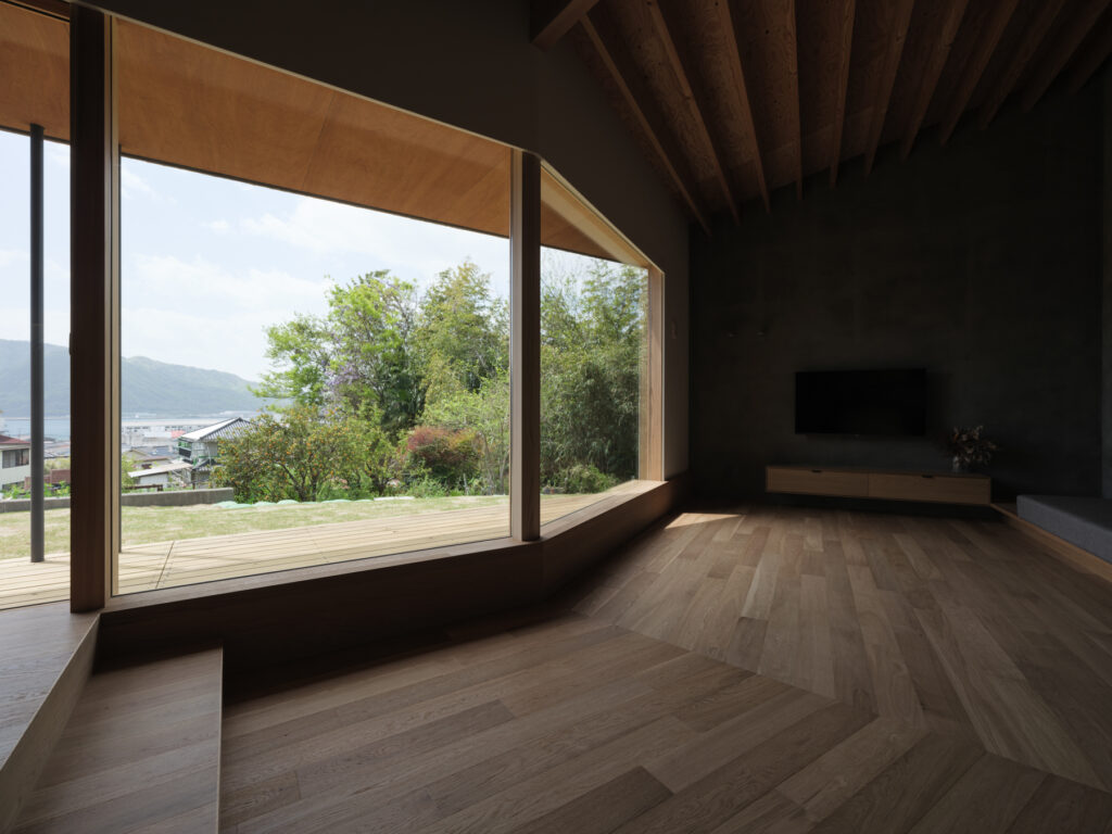 瀬戸の島々を見晴らす高台に、のびやかに佇む一棟の住まい。細長く難しい変形地の個性を生かし、ゆるやかに2度折れ曲がるカタチとなりました。西側にはリビングとダイニングキッチンをL字に並べ、海へ向かって大きな2面の窓を開放。ふんわりと景色を抱き寄せるような佇まいが、この土地ならではの魅力をそっと引き出しています。