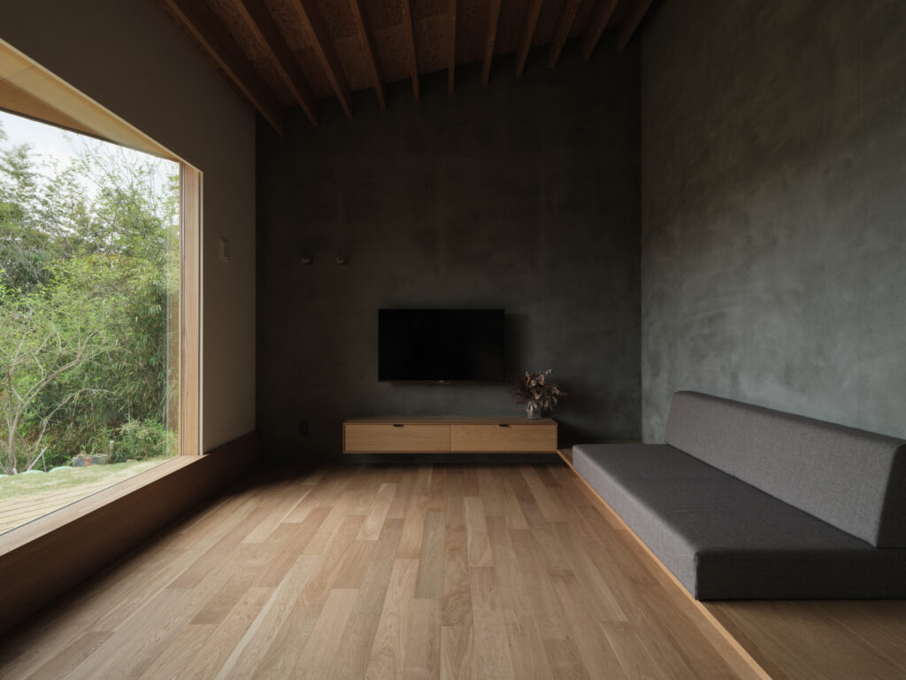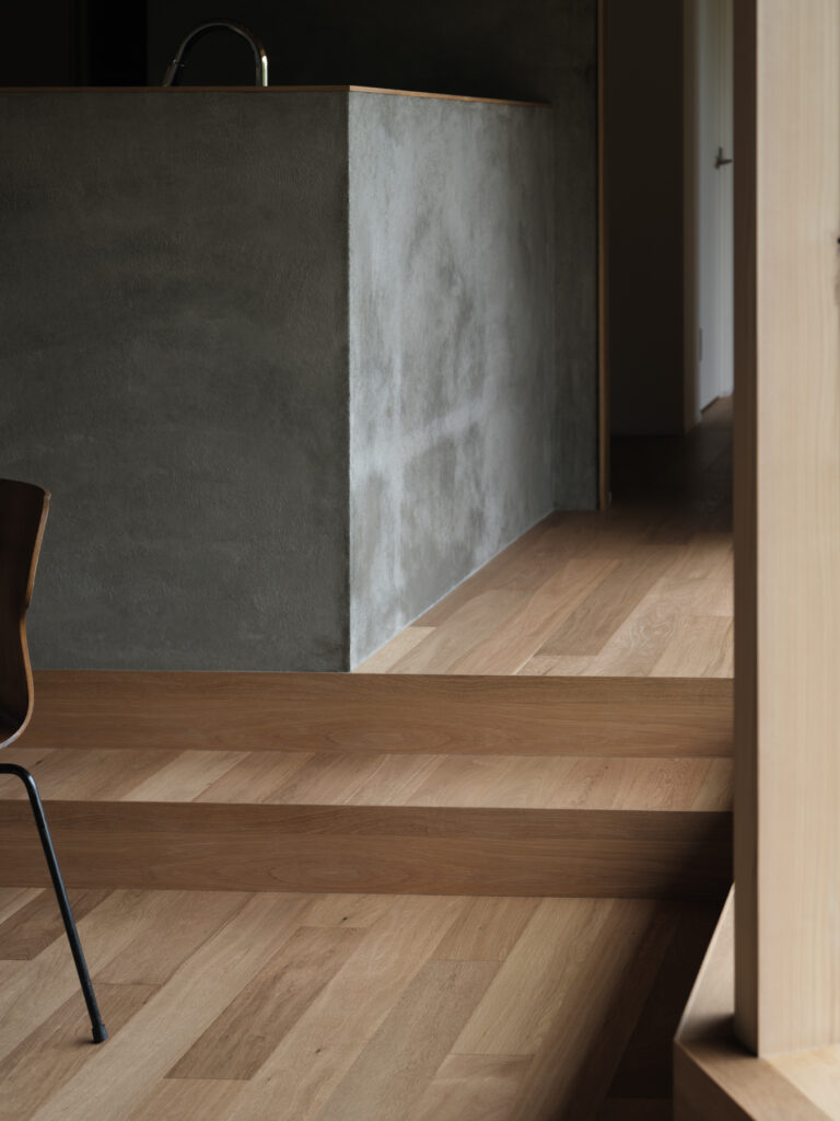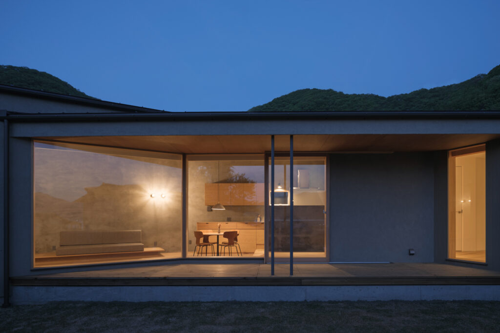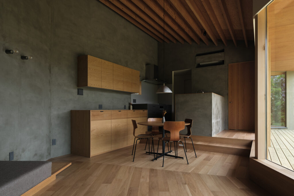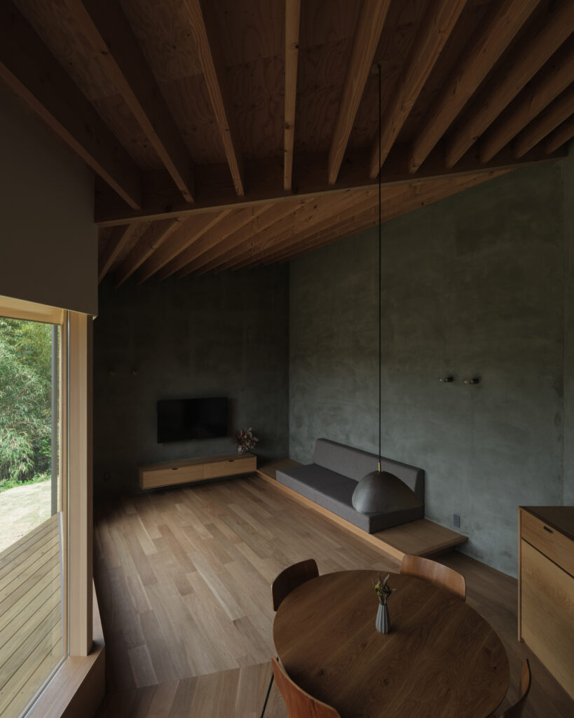 明るい窓辺から室内奥へと進むにつれ、陰影が深まる絶妙な空間が展開されます。キッチンから2段下がったリビングは中庭まで連続し、豊かなくつろぎ感を演出。ダイニングに座ると木々と集落の隙間から正面に海が見える計算された視線計画。夜には小さな明かりが灯り、オーク床とモルタル壁が創り出す静謐な時間が流れます。
