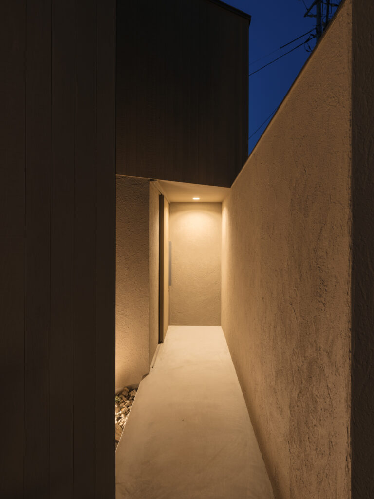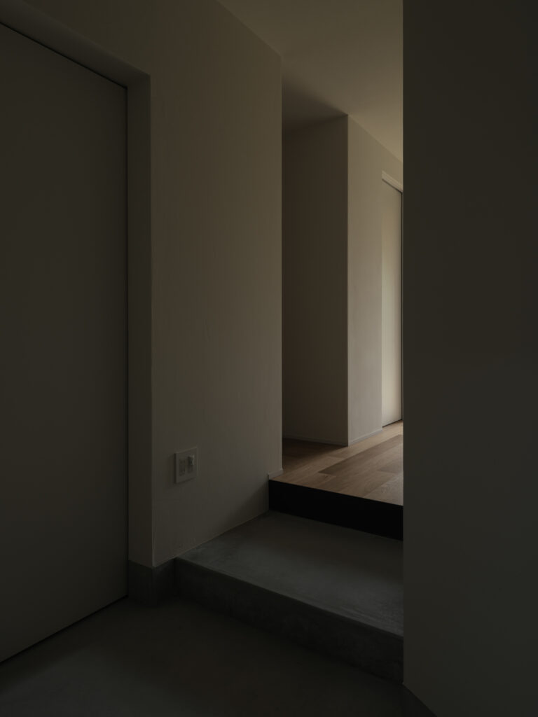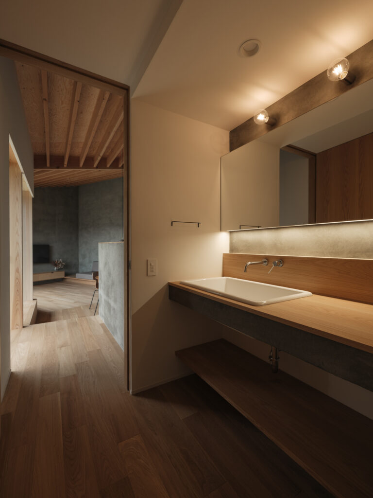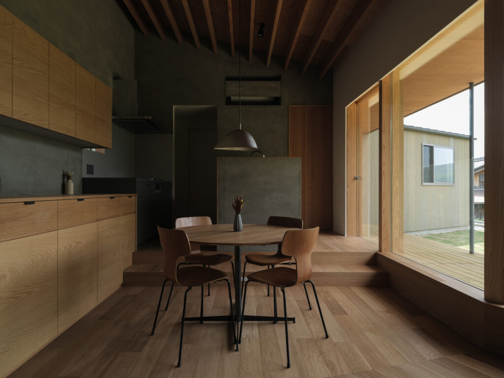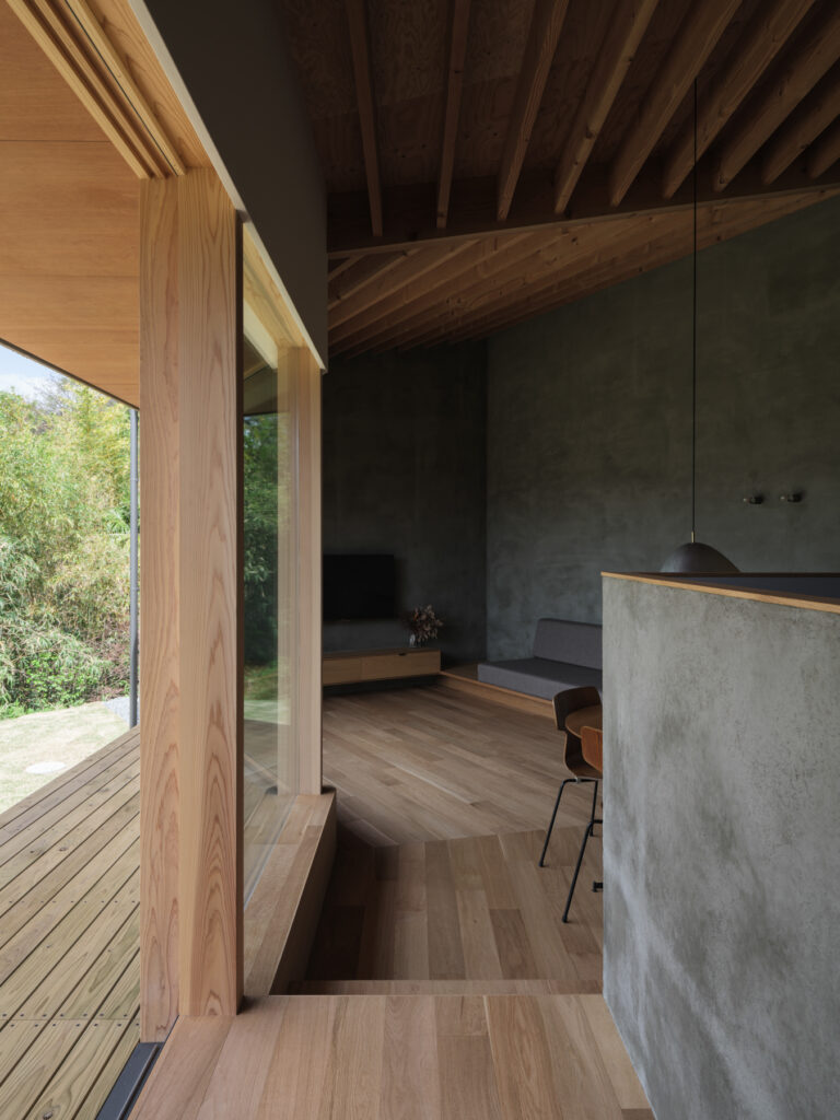 明るい窓辺から室内奥へと進むにつれ、陰影が深まる絶妙な空間が展開されます。キッチンから2段下がったリビングは中庭まで連続し、豊かなくつろぎ感を演出。ダイニングに座ると木々と集落の隙間から正面に海が見える計算された視線計画。夜には小さな明かりが灯り、オーク床とモルタル壁が創り出す静謐な時間が流れます。