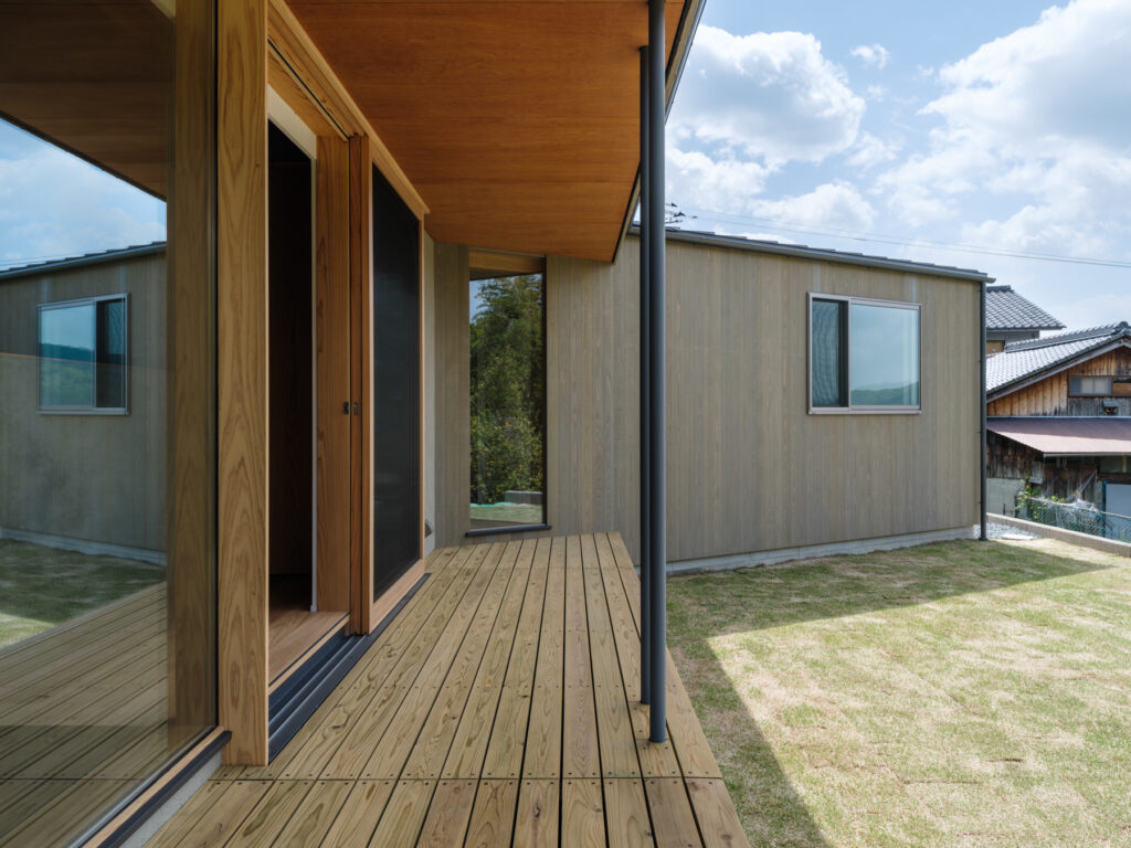 天井勾配に対して平行に垂木を並べる稀有な構造は、整然とした機能美を体現。職人の卓越した技術が随所に息づいています。縁側のような長いデッキには深い軒が心地よい日陰を創出し、グレー塗装の杉板張り外壁が静かな存在感を放ちます。中庭のプライバシーを保つ斜めの棟配置も含め、内外が調和した無二の住まいが実現しました。