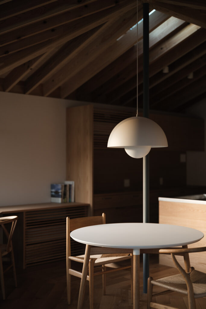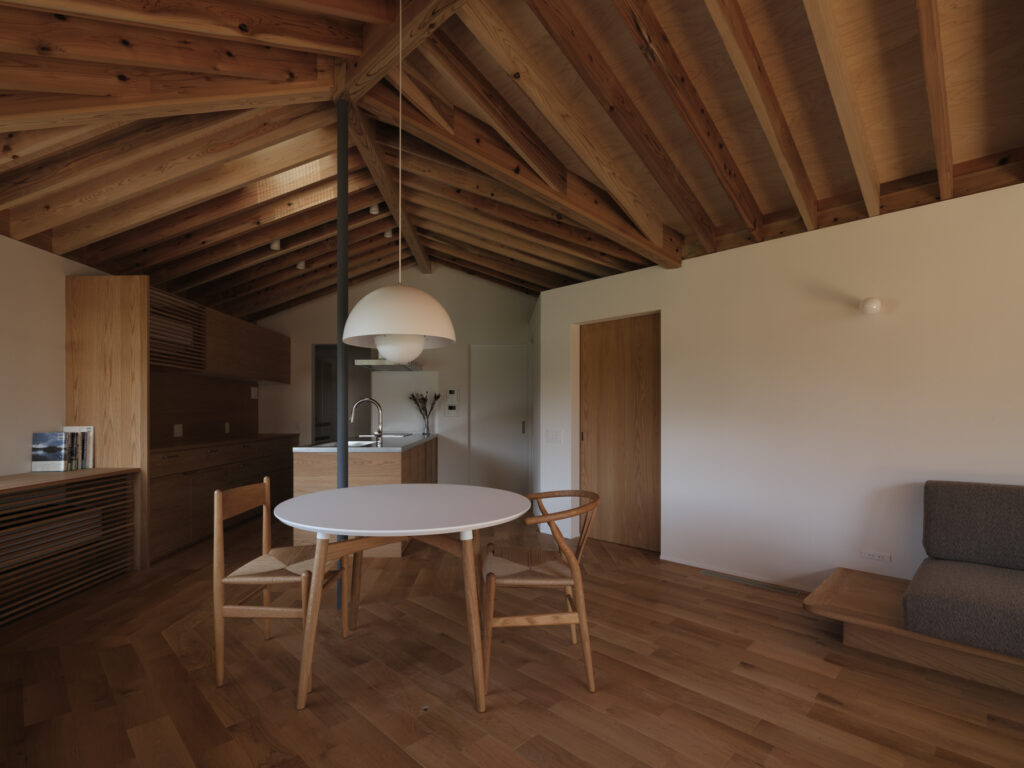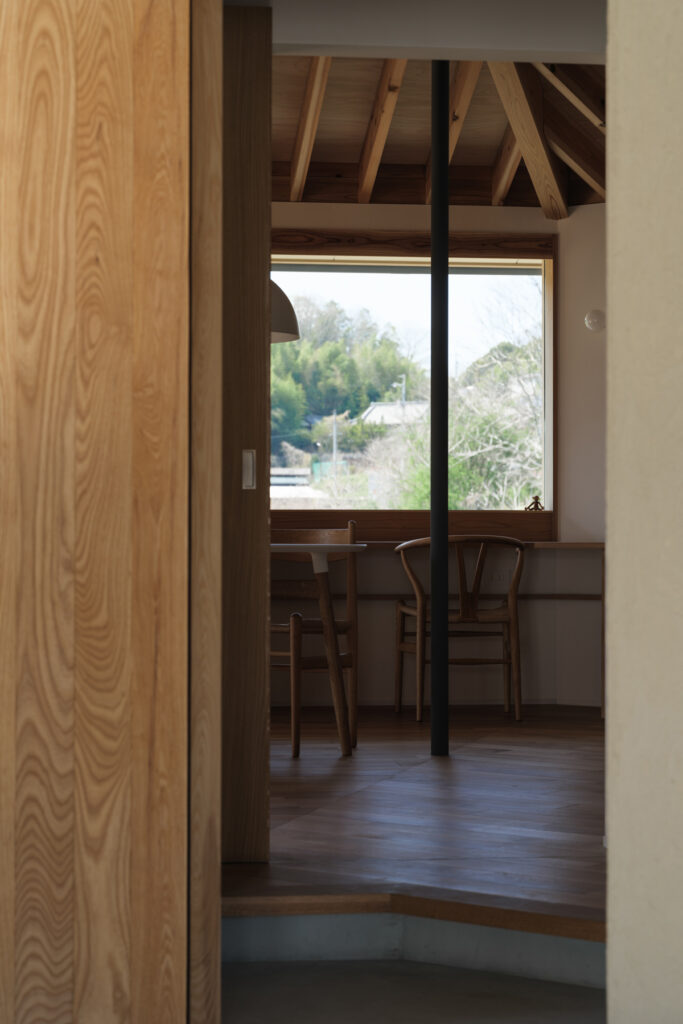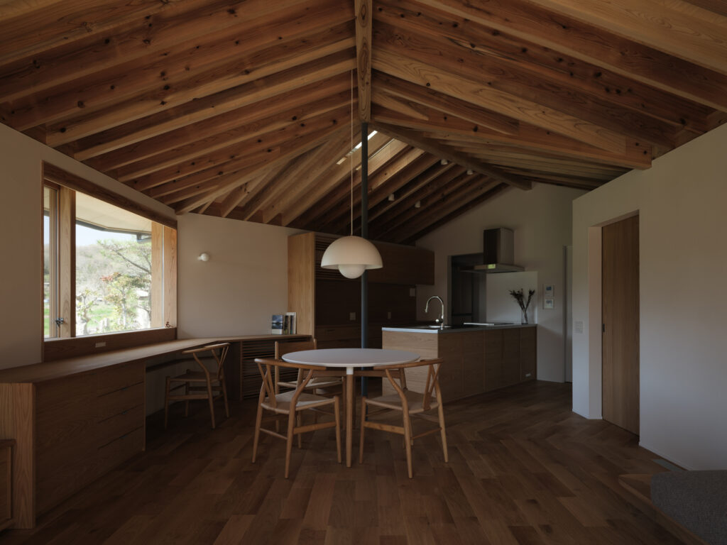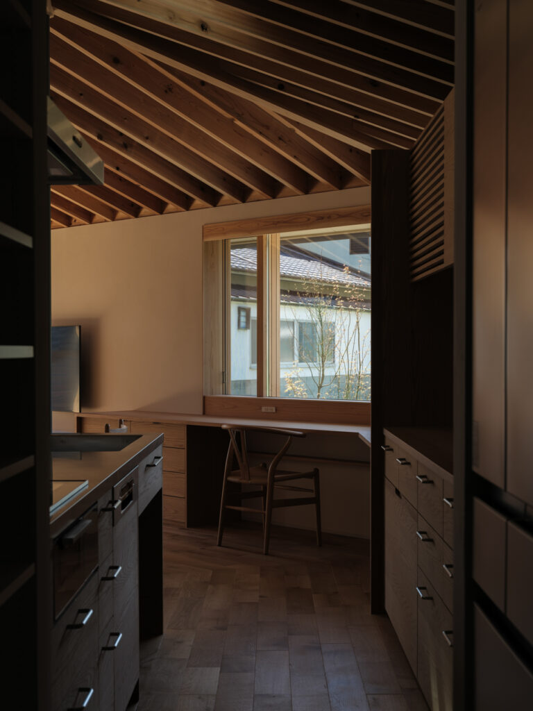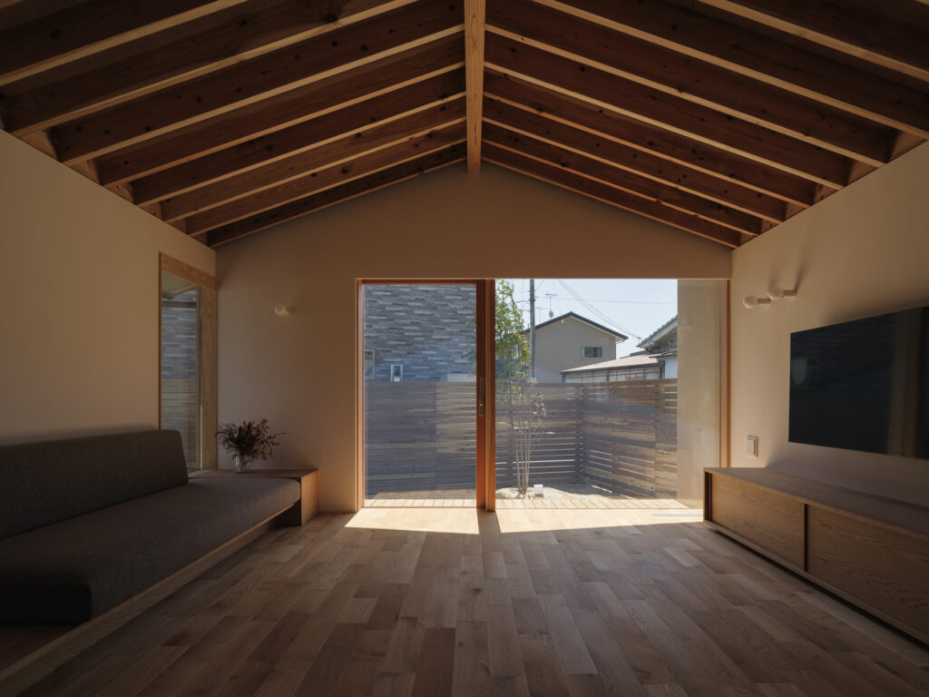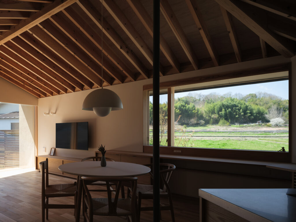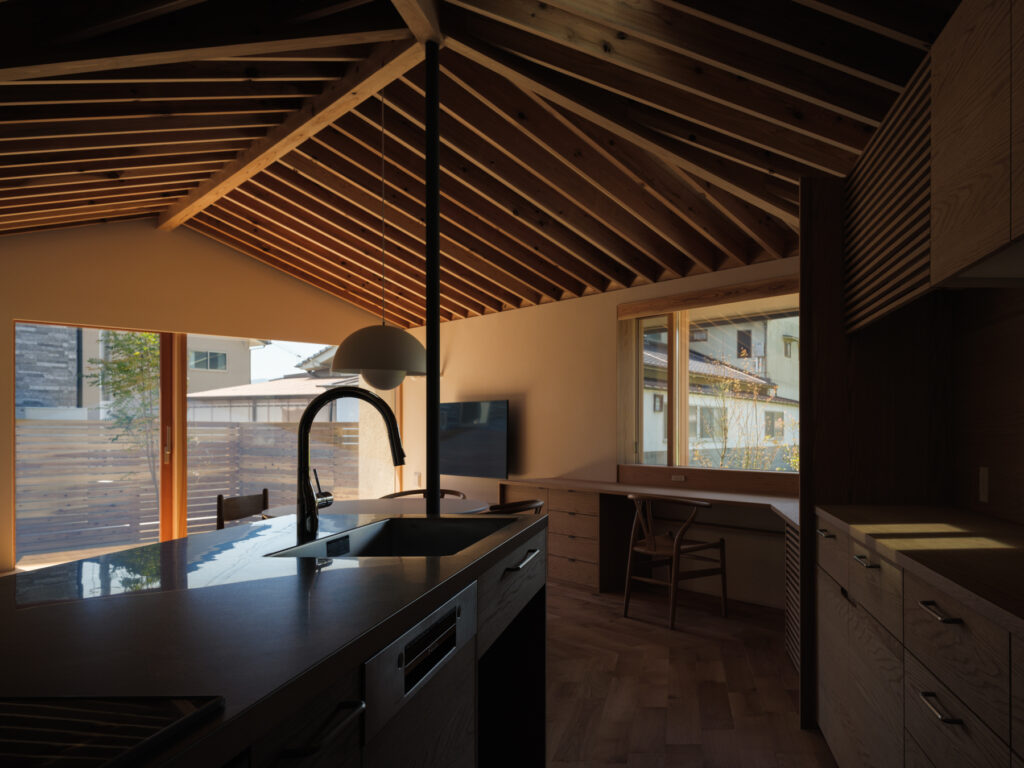 緩やかに「へ」の字に曲がったLDKは、心地よい奥行き感。整然と並ぶ化粧垂木が印象的な天井は、職人の丁寧な仕事により床材と角でピタリと突き合わされ、美しい仕上がりを実現しています。隣家の視線を上手にかわしながら、目線の先々に心を和ませる良い風景と居場所を配置した、暮らしに寄り添う住まいです。