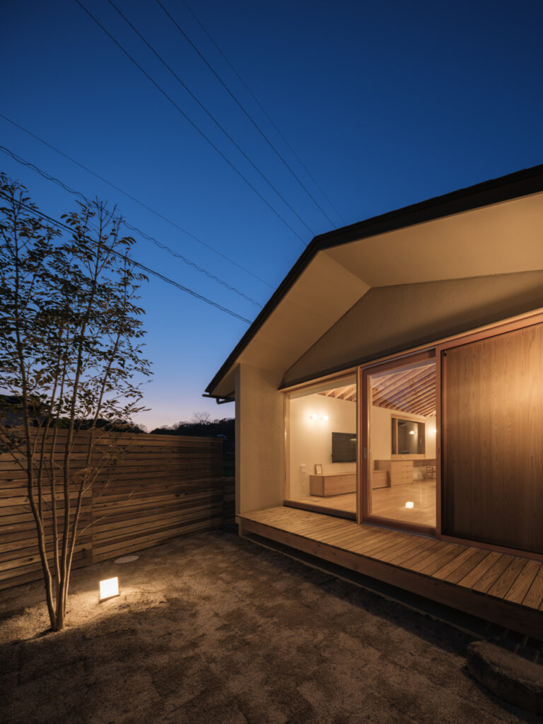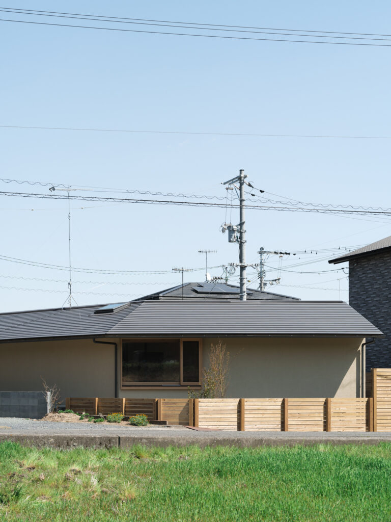 分譲地内の台形という制約を逆手に取り、北端で鋭角に折れたV字型の平屋を実現しました。東側の進入路からは閉じた印象ながら、ガレージ横の細いアプローチを抜けると、中庭を囲む豊かなくつろぎの空間が展開します。西側に広がるのどかな田んぼの風景を最大限に活用し、敷地の個性を生かした独創的な設計が光ります。