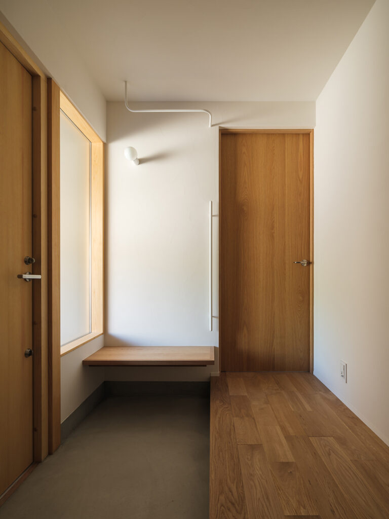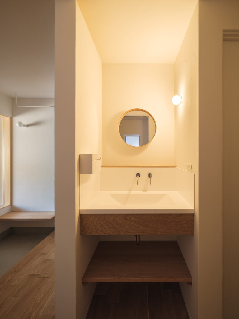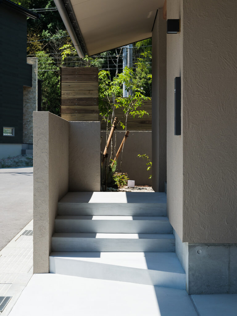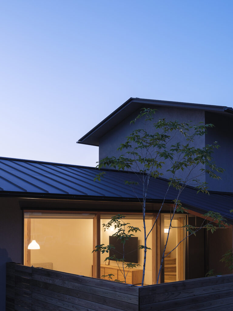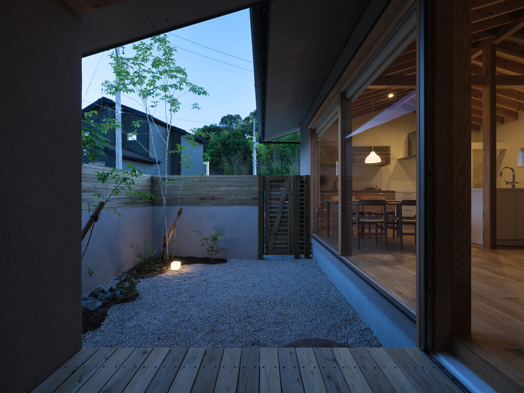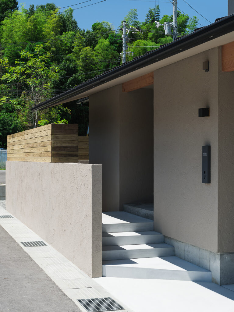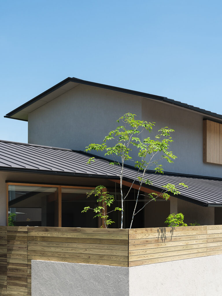 福山市郊外の山林と田畑に囲まれた分譲地に、50坪ほどの敷地を最大限に活用した住まいです。駐車・居住・庭という三つの要素に連続感を持たせることで、窮屈さを感じさせない伸びやかな佇まいを創出しています。限られた面積の中でも、視線の抜けと動線の流れを意識した設計により、ゆとりある住環境となっています。