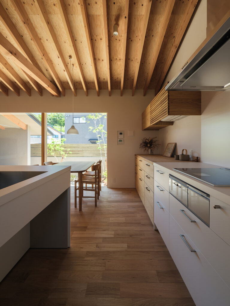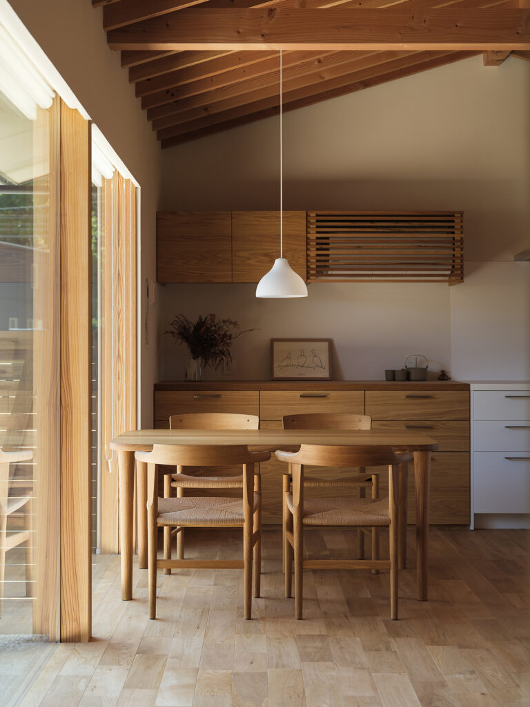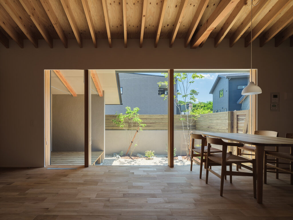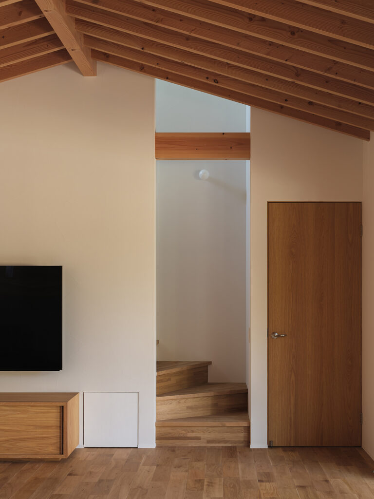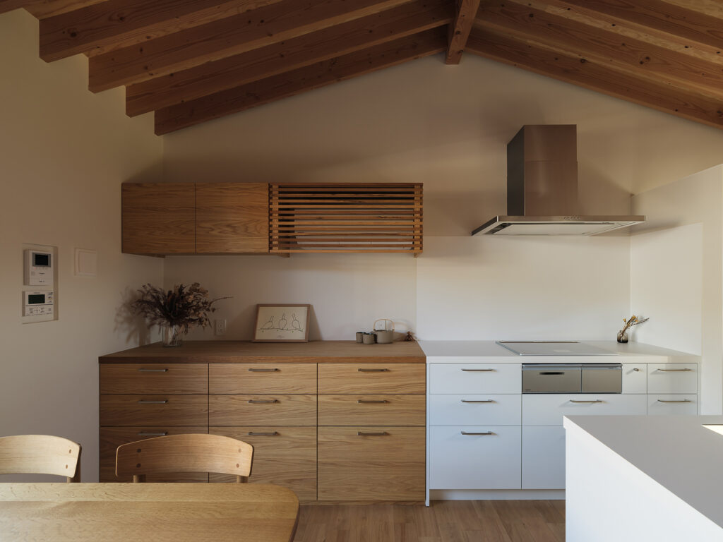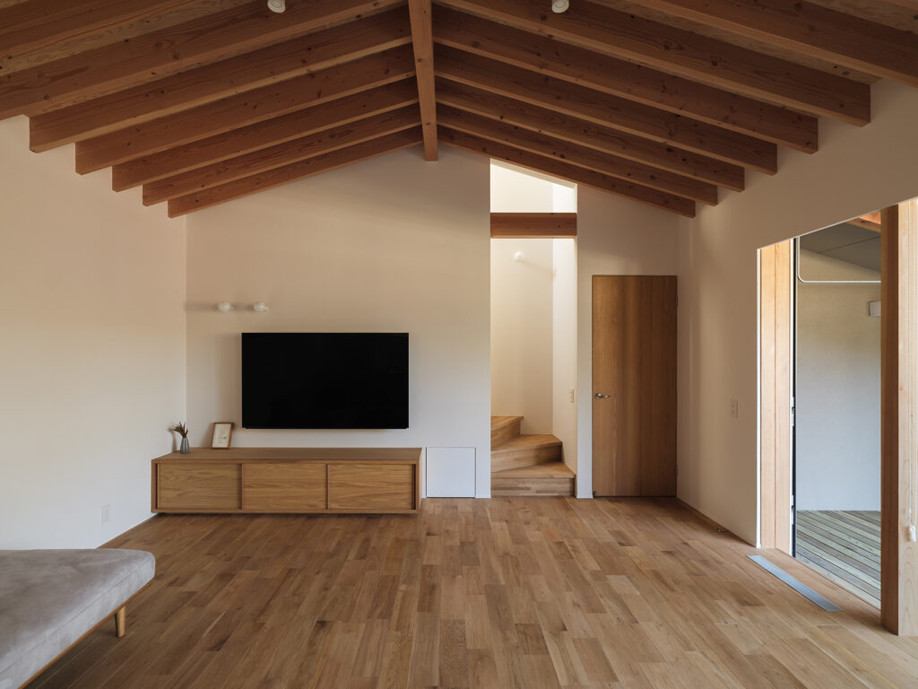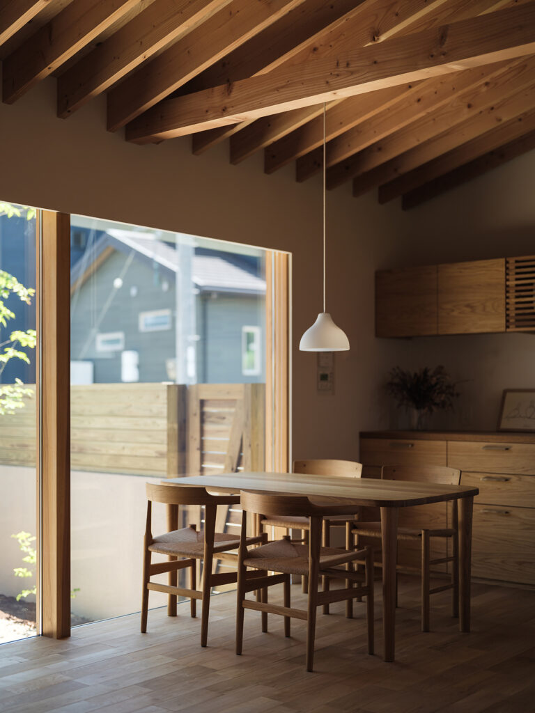 LDKには勾配天井を採用し、化粧垂木を現しにすることで構造美を際立たせました。天井の高低差が視覚的な変化を生み、空間に奥行きと立体感をもたらしています。木材の質感が天井面に表情を与え、自然素材ならではのあたたかみが室内に広がります。大きな開口部から差し込む光が垂木の陰影を際立たせ、時間の経過とともに移ろう表情を楽しめる仕掛けとなっています。