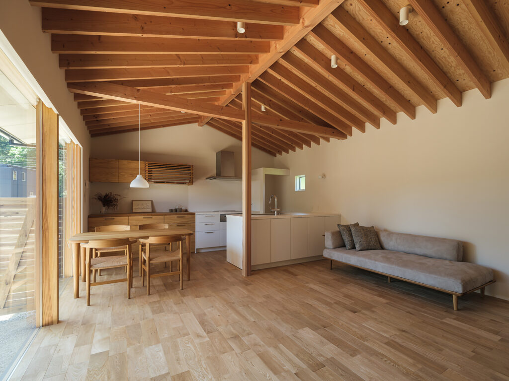 化粧垂木を現した勾配天井が、構造の美しさと空間の広がりを同時に実現しています。