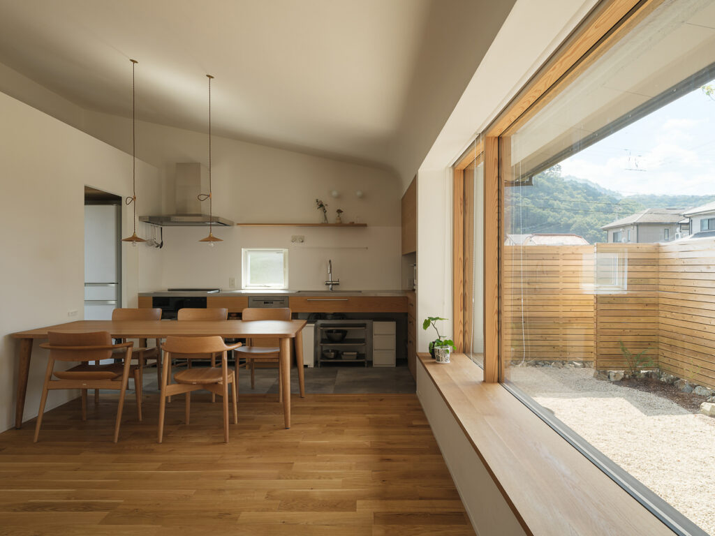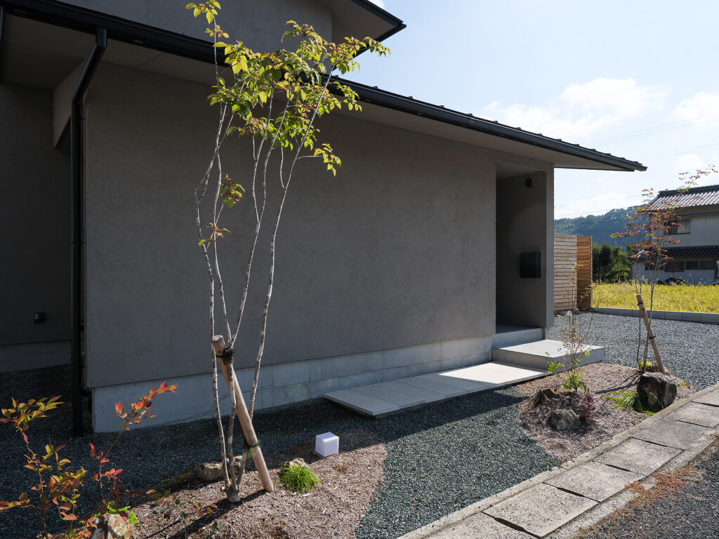 井原市西部の新興住宅地に立つこの邸宅は、北西角地という立地を最大限に生かした設計が特徴です。L字型に配置された建物が中庭を囲み、植栽と板塀によって道路や隣家からの視線を遮断。周辺には田畑が多く残り、将来的な宅地化も想定されるなか、外部環境の変化に左右されない明るく開放的なプライベート空間を実現しました。ほぼ正方形の敷地形状を読み解き、内に広がる豊かさが追及されています。
