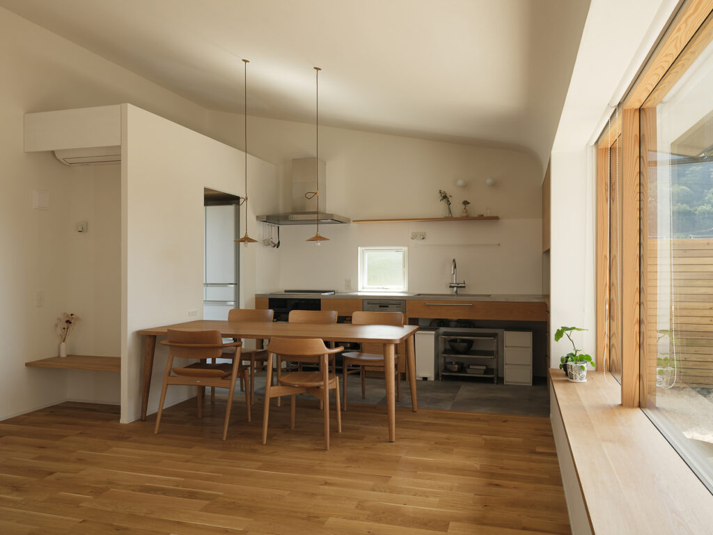 中庭に面した大きな開口部からは、季節ごとに表情を変える植栽が目に映ります。子どもたちの成長とともに、リビングでの過ごし方や庭との関わり方も変化していく。そんな家族の時間の積み重ねを受け止める、柔軟性のある間取りも魅力です。約34坪という適度な規模感が、家族5人の距離感を程よく保ちます。