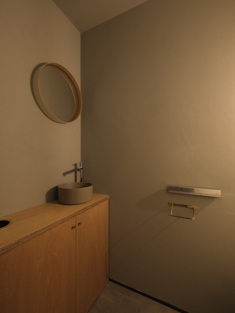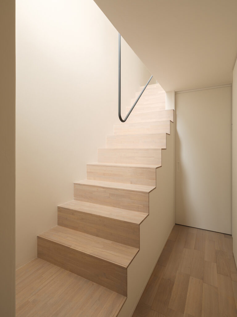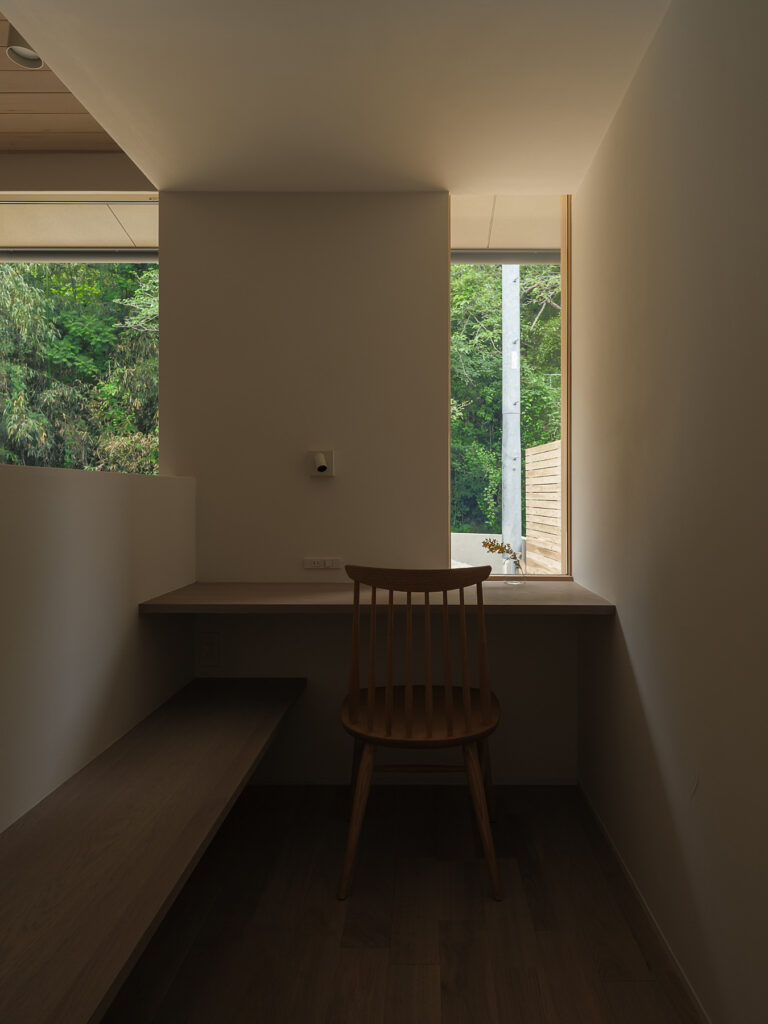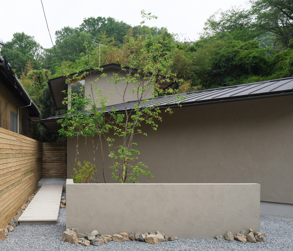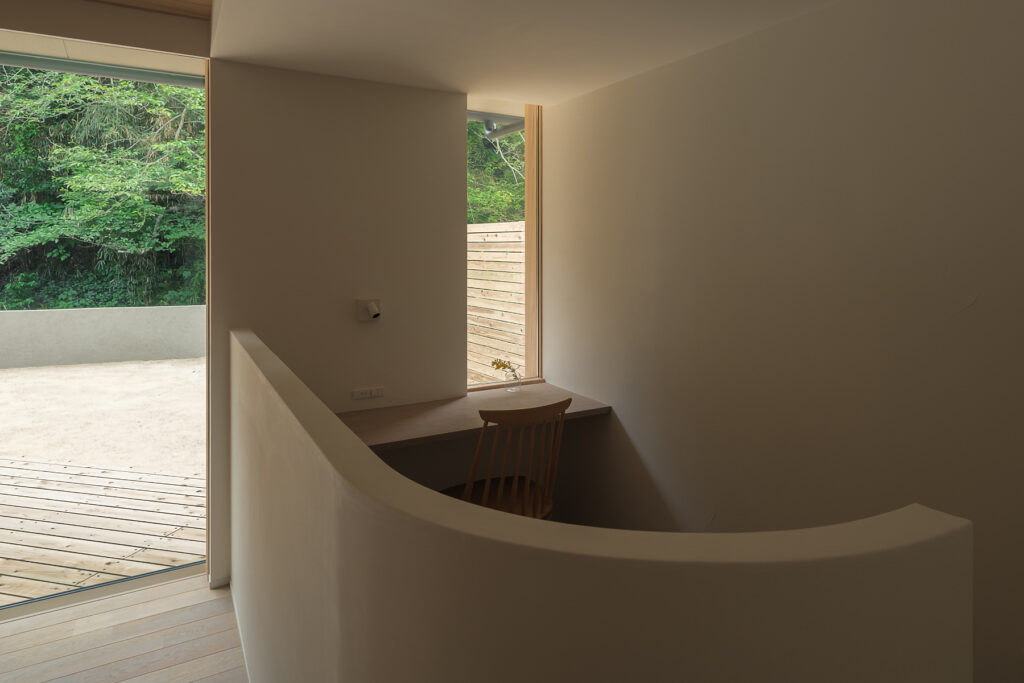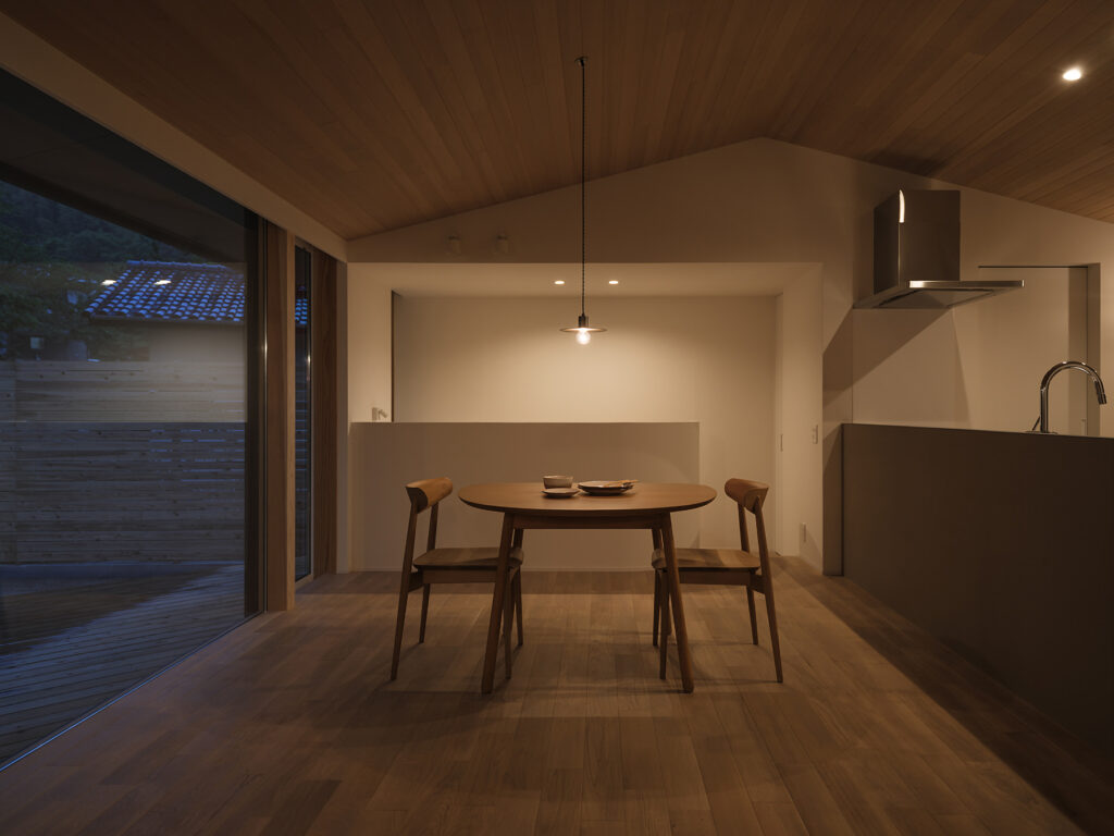 因島の谷間に広がる寺院や古い町並み、みかん畑や桜並木。こうした穏やかな瀬戸内の風景に寄り添うように、シンプルな切妻屋根をくの字に折り曲げた建物。南側の桜並木を囲むように配置された形状は、表と裏、二つの庭を生み出しました。周囲の自然を受けとめながら、季節の移ろいを身近に感じられる佇まいです。