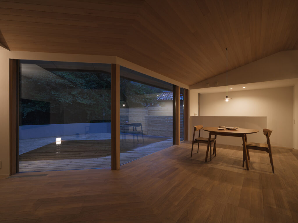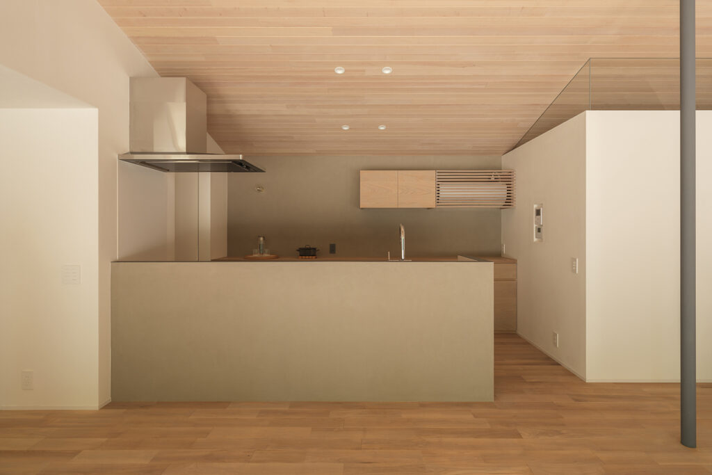 くの字の形状に沿って展開するリビングは、羽目板を張った天井が連続感を演出します。ホールやシューズクロークに面する仕切り壁の上部にはガラスを採用し、視線の広がりを確保しました。木のぬくもりが満ちる室内は、光と影が織りなす表情豊かな時間を刻みます。家族それぞれの居場所が緩やかにつながる、開放的でありながら落ち着きのある設えです。