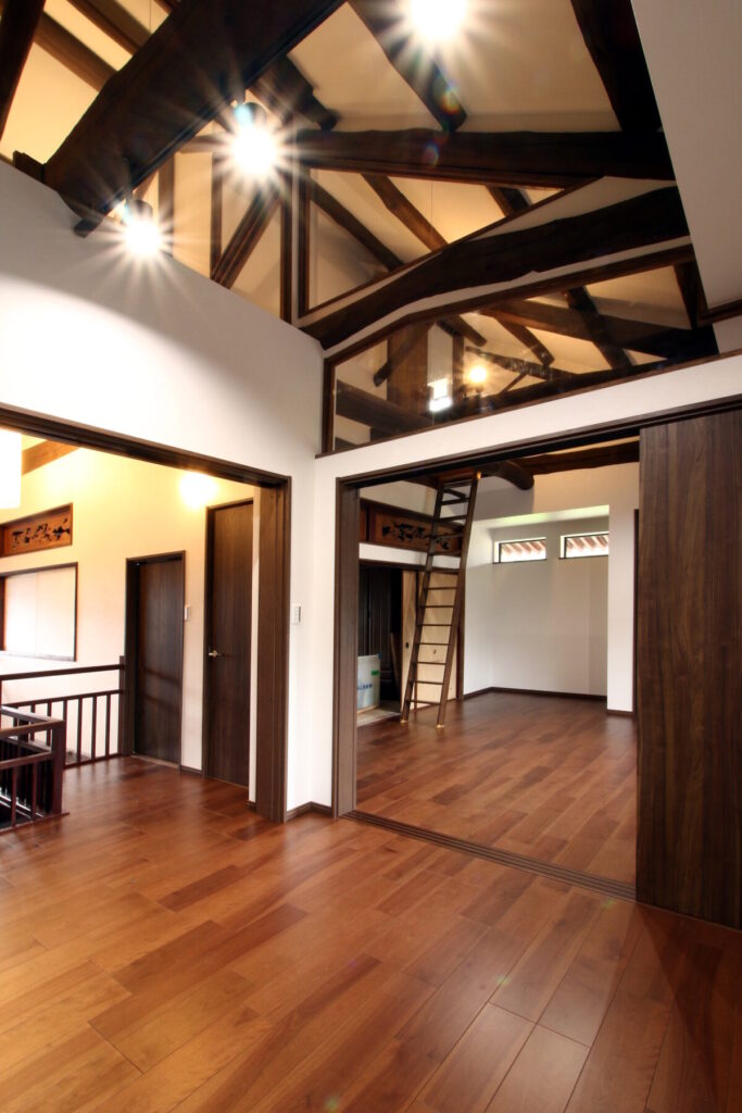 段差を解消し、手すりや引き戸を随所に設けてバリアフリーを徹底。2階は和室を洋室へ改装し、クローゼットや小屋裏収納を新設。アクリルパネルや勾配天井を活用し、採光と冷暖房効率にも配慮しています。