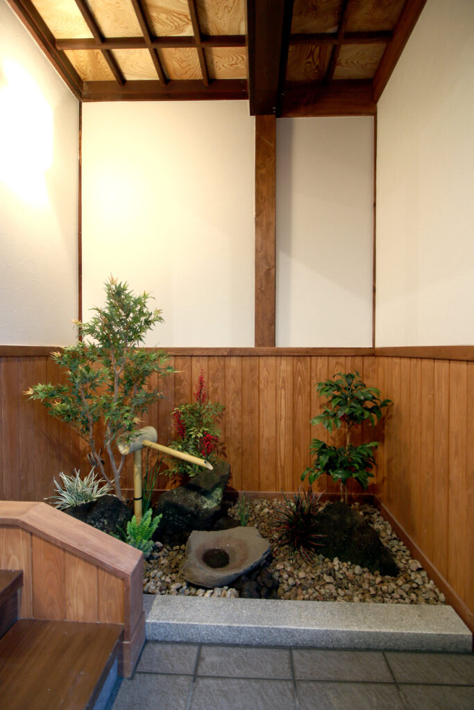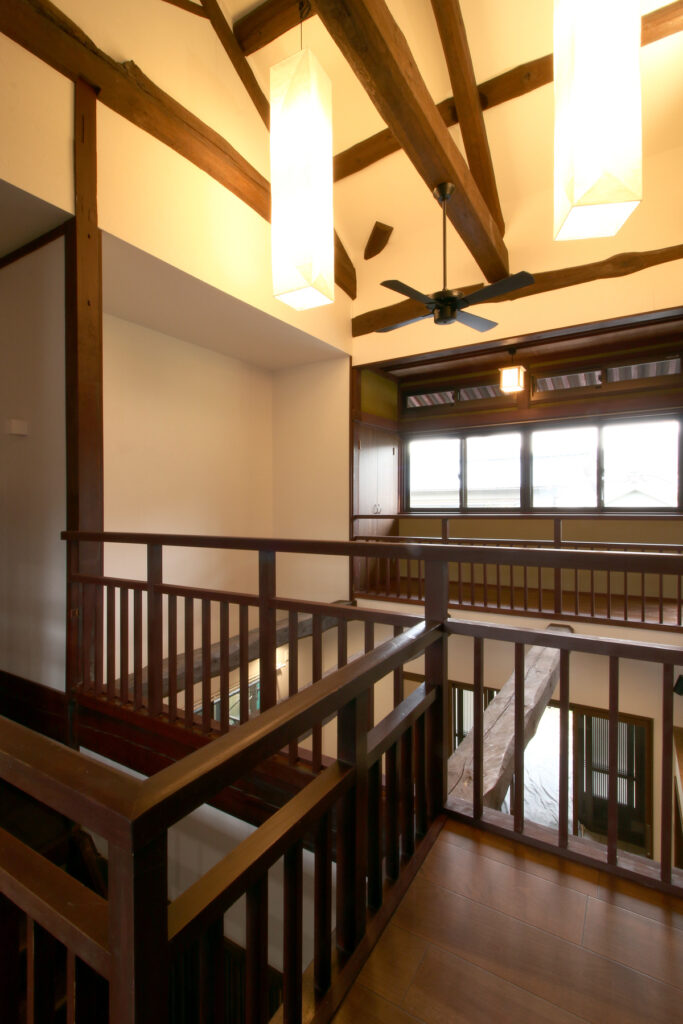 築74年の木造住宅を全面的に刷新し、構造美を際立たせる梁や柱を残しつつ、現代的な機能性を加味したリノベーションを実現しました。玄関は増築し、格天井や坪庭を設けることで、旅館のような格式と開放感を演出。吹き抜けを設けたことで、2階からの自然光が玄関ホールに降り注ぎ、住まい全体に明るさと奥行きをもたらしています。