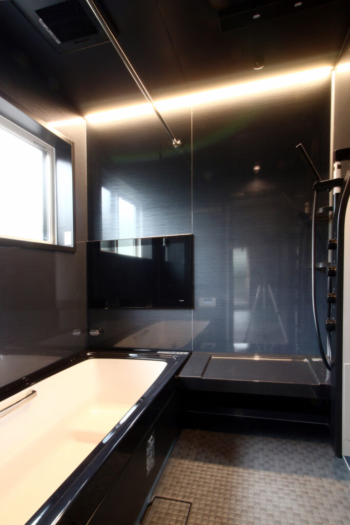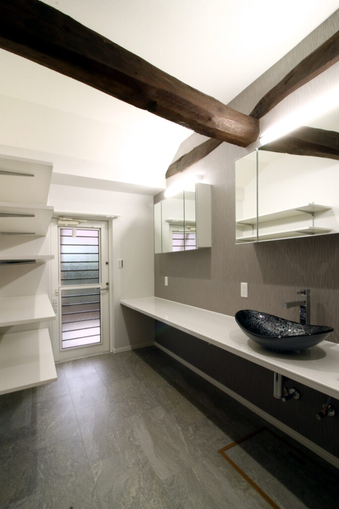 洗面脱衣室は広く確保し、2つの鏡と収納を設置。物干しテラスへの直結動線により洗濯作業が効率化されました。浴室はユニットバス化し、保温性や安全性を向上。LDKは柱を抜いて補強し、床暖房や高天井を採用。アイランドキッチンやパントリー、システム収納を備え、家事のしやすさと収納力を両立しています。