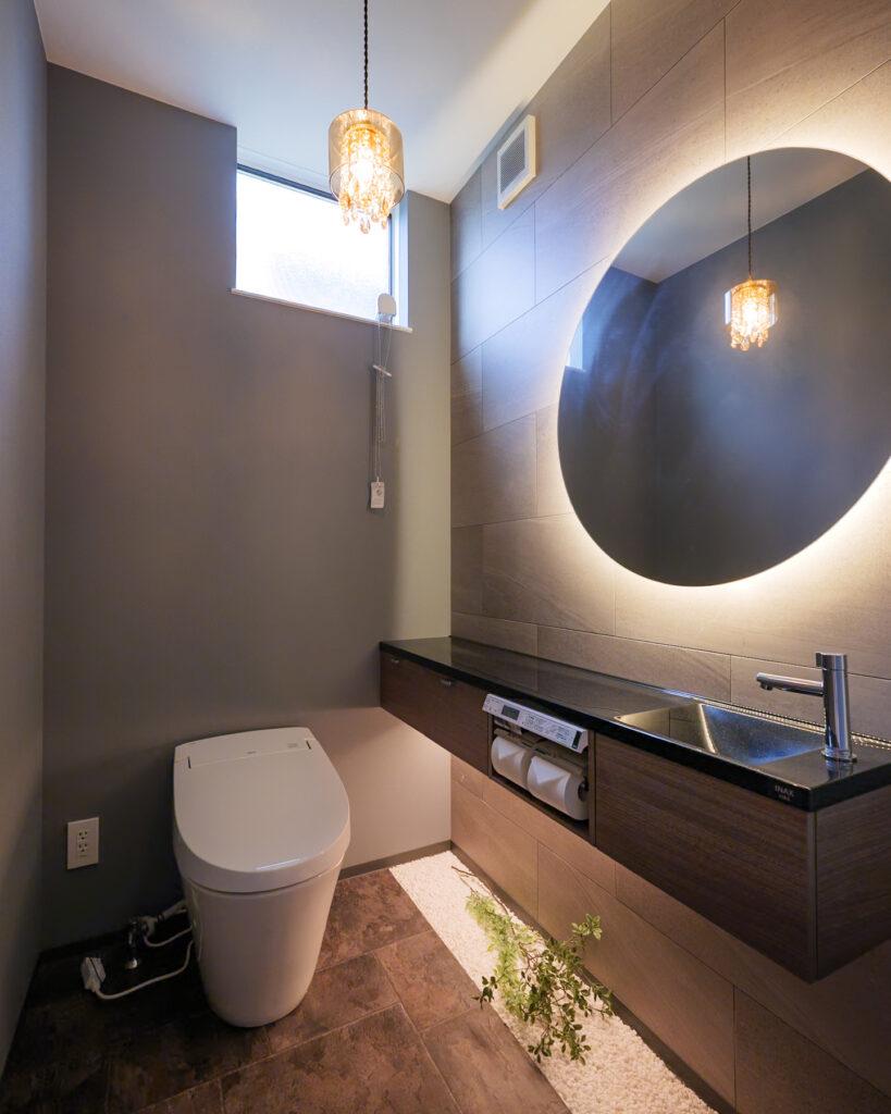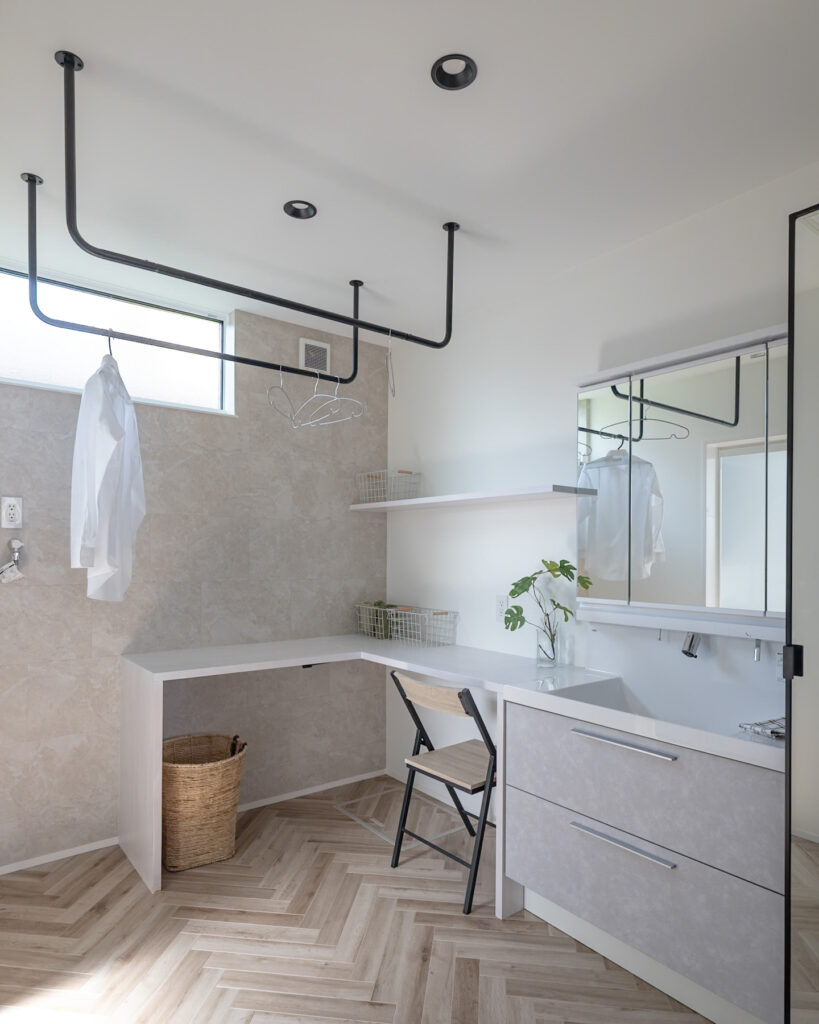 キッチンはダイニング一体型アイランド仕様とし、配膳や片付けの効率を追求。背面には幅2700mmの大容量カップボードを設置。洗面脱衣室はキッチン横に配置し、家事の流れを最適化。トイレや階段も刷新し、圧迫感を排除しつつ、細部まで使い勝手を高めています。