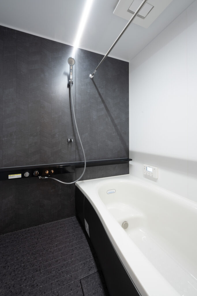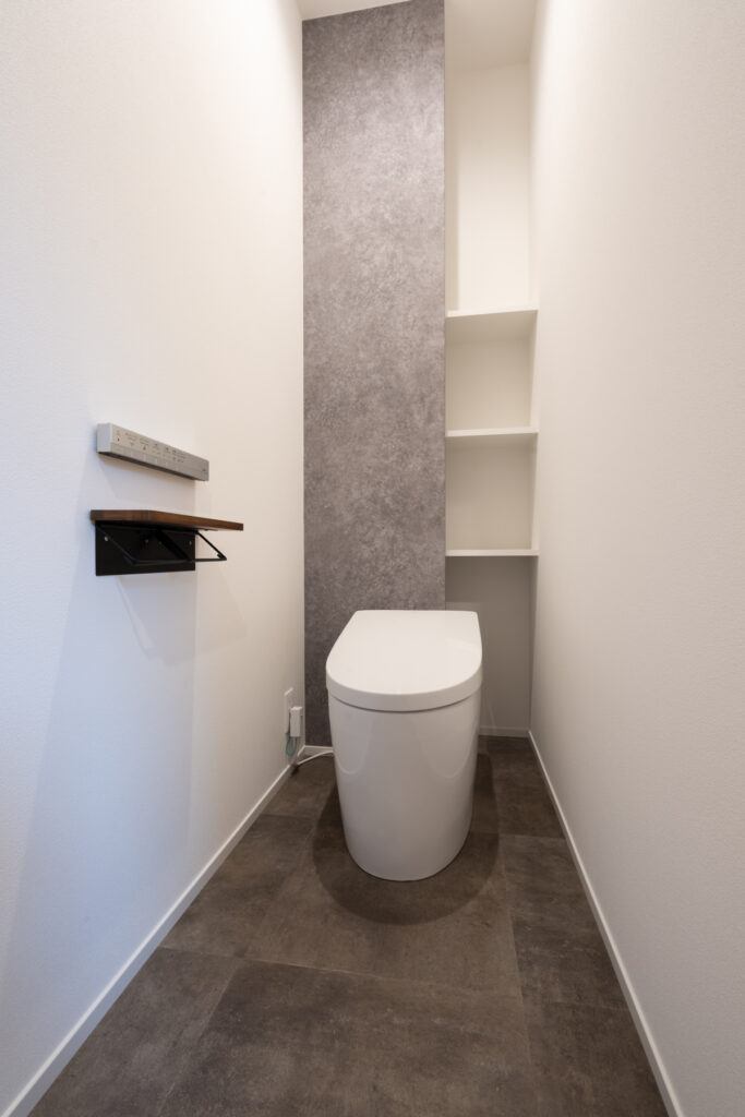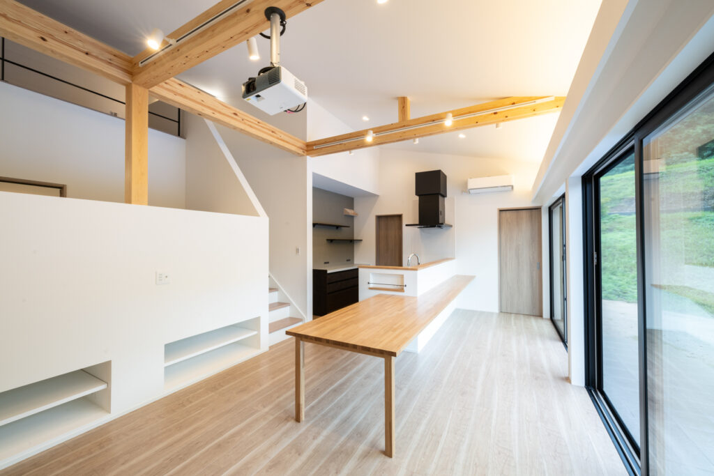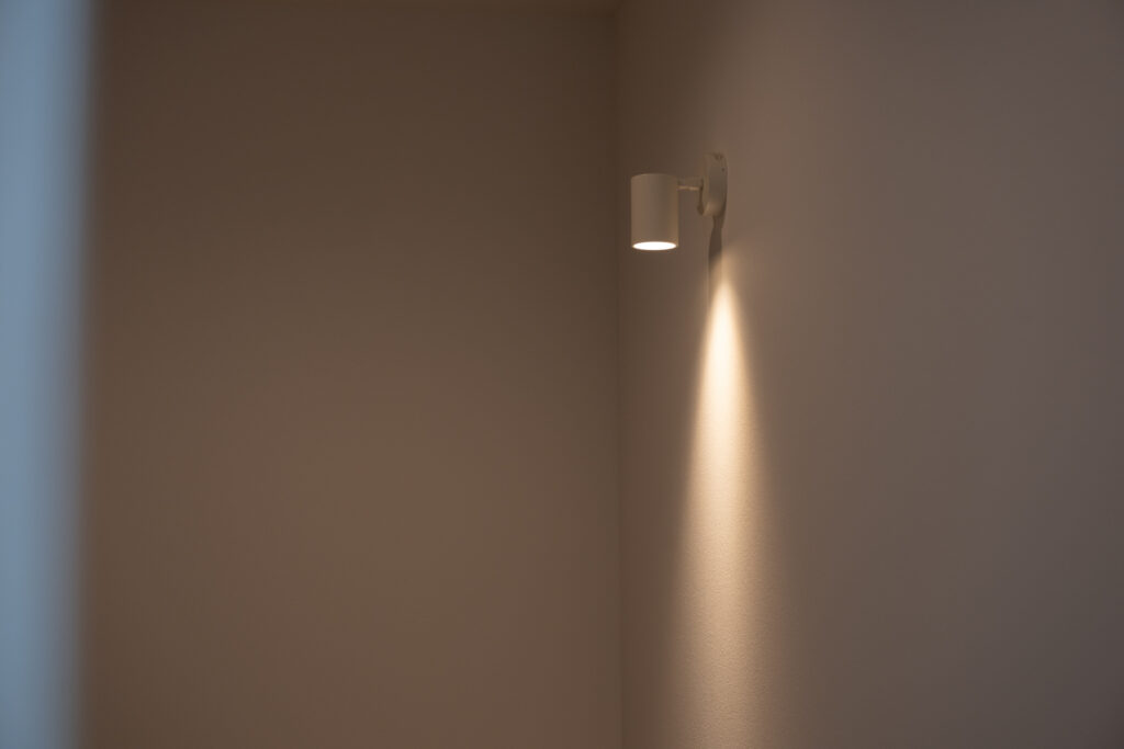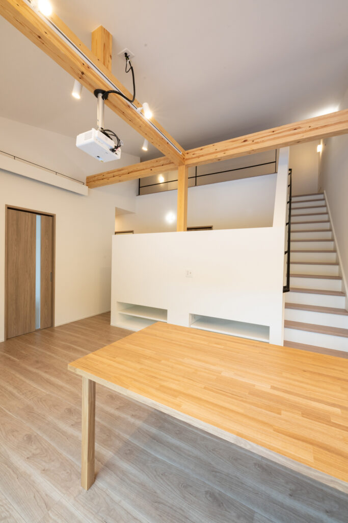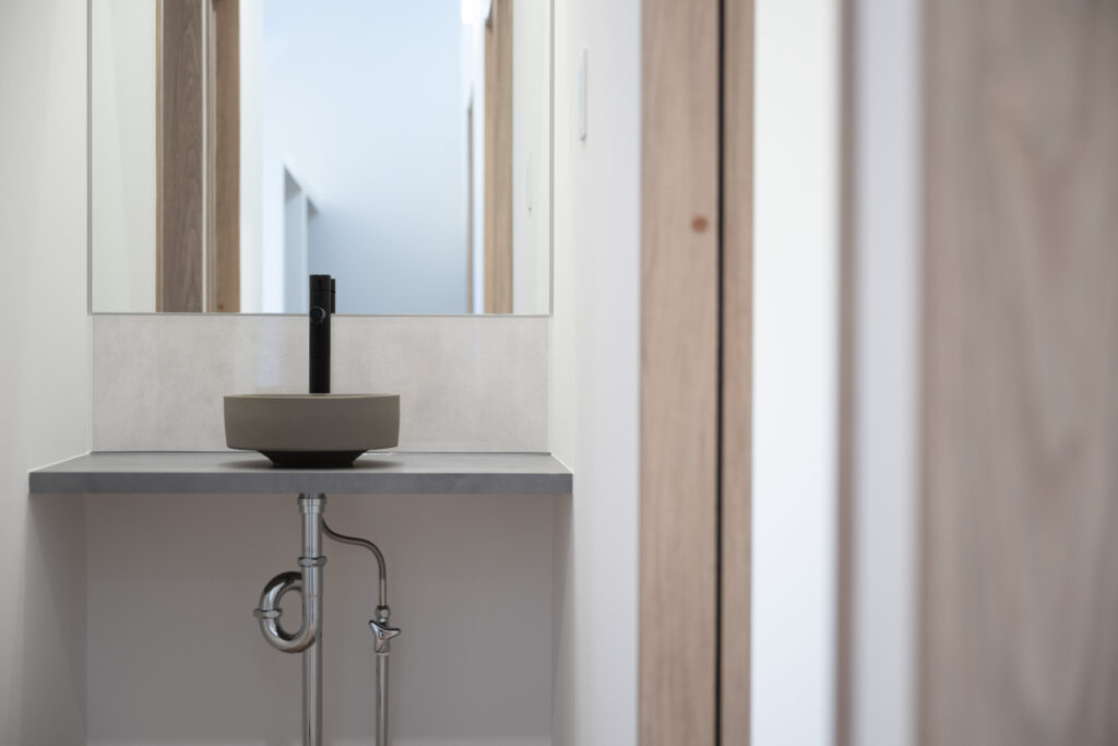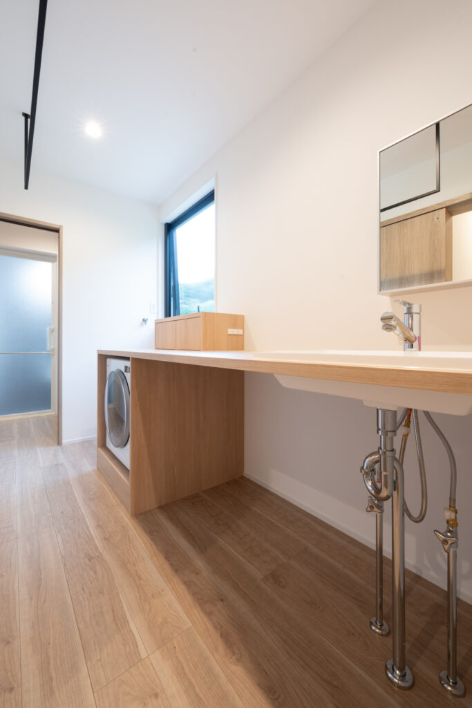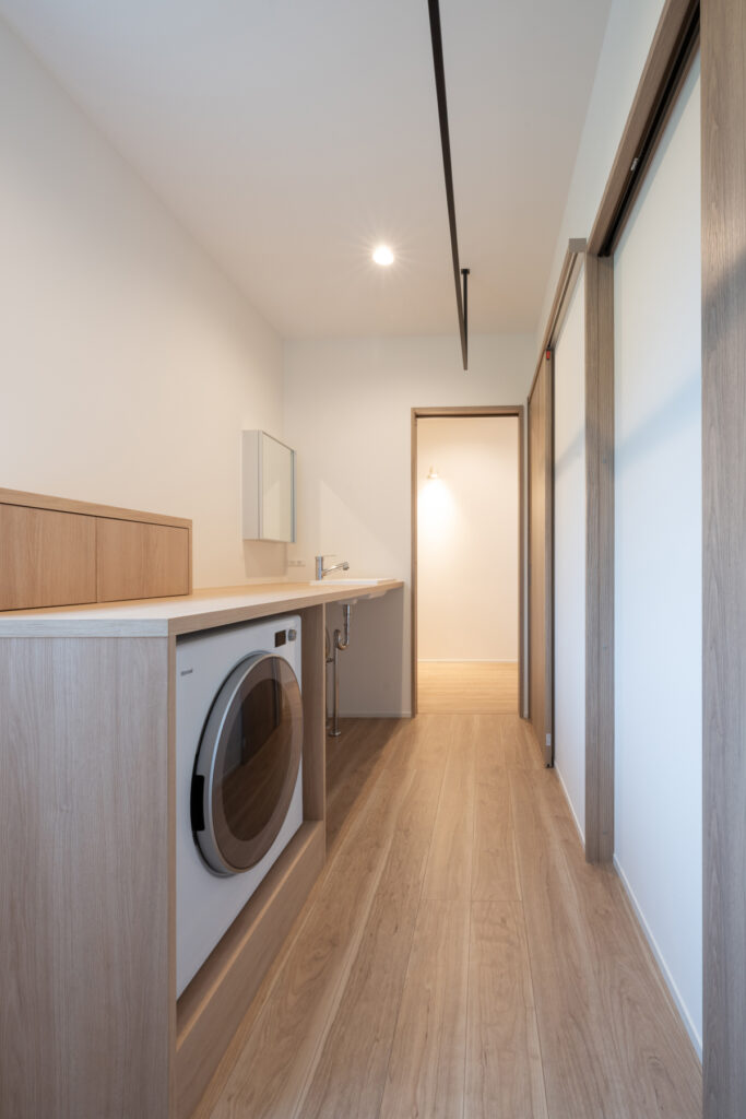夜になると、リビングの壁に映像が広がります。プロジェクターとロールスクリーンで、家族の映画タイムが始まる瞬間です。洗面まわりは、洗濯から身支度までの流れをひとつの場所に集約。朝の慌ただしさが、静かに整理されていくような設計になっています。