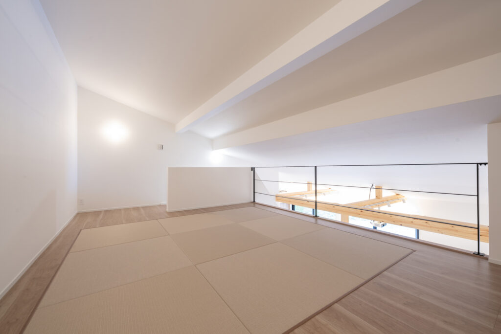 小屋裏へ続く階段を上ると、天井の低い、こもるような空間が待っています。大人には少し窮屈でも、子どもにとってはそれが心地よい。本を読んでも、昼寝をしても、ただぼんやりしていても許される場所。お子さまたちが少しずつ大きくなるにつれ、この空間の使い方も変わっていくでしょう。