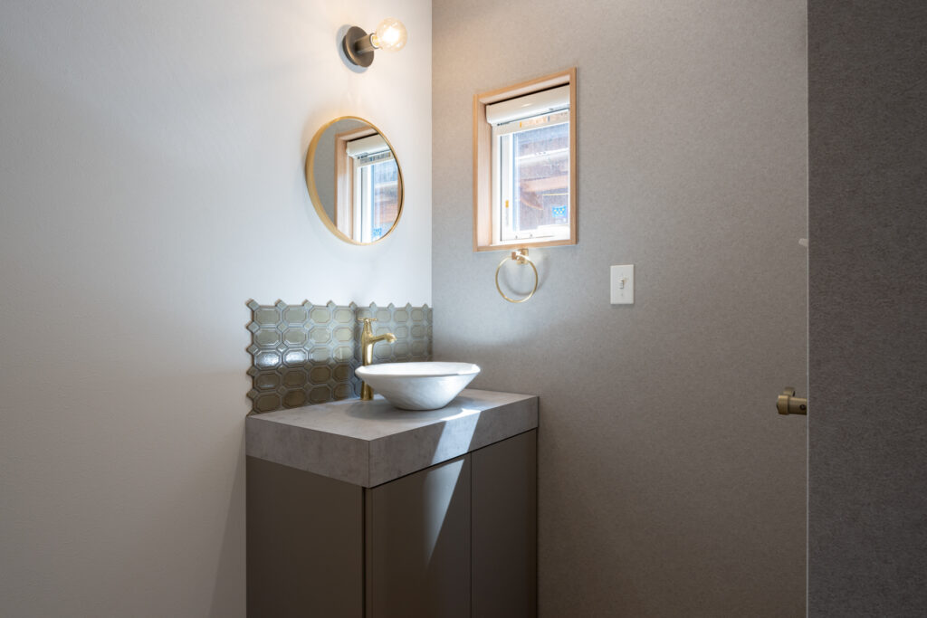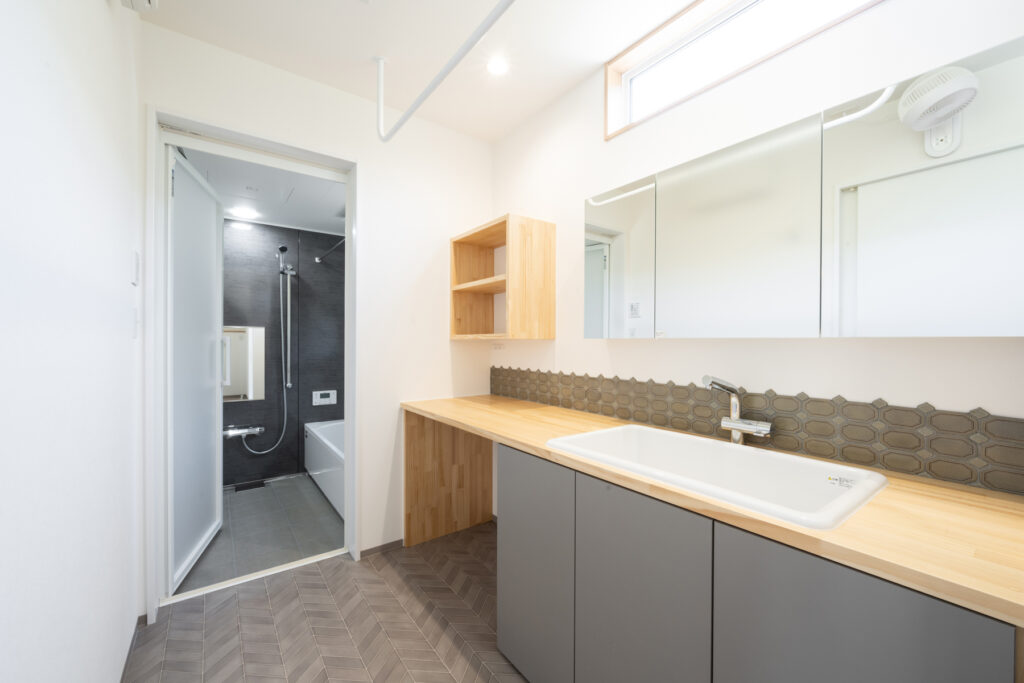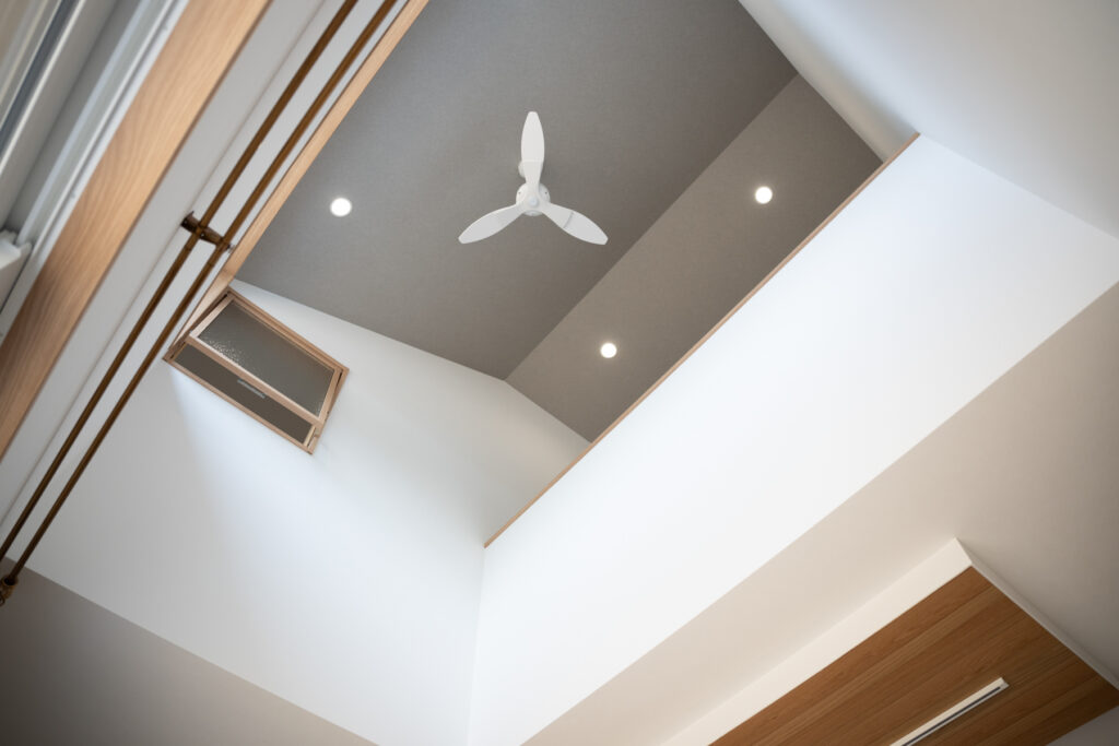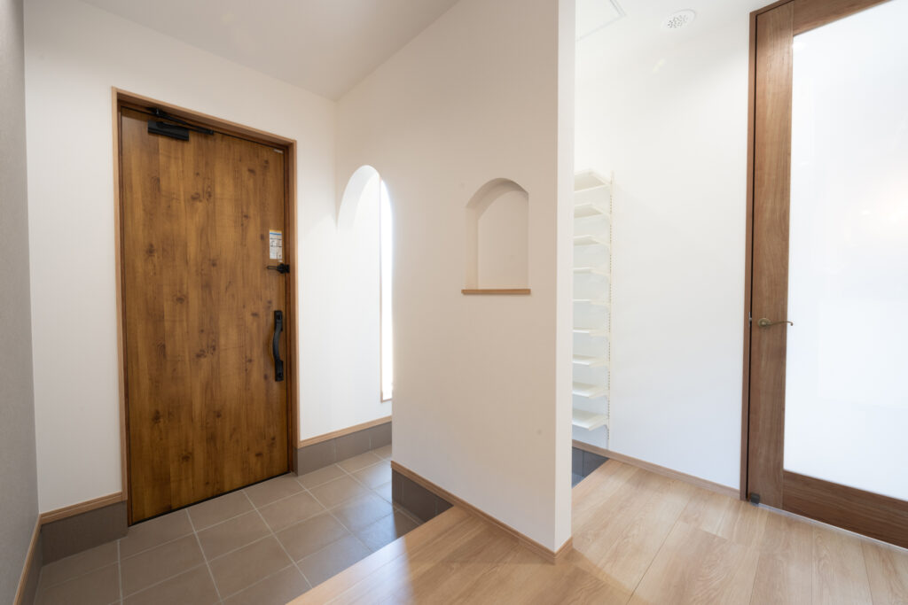 お子さまたちが元気に過ごせる場所を、家のあちこちに散りばめたいと考えたご夫婦。吹き抜けを中心に据えたLDKは、1階と2階の空気がゆるやかにつながり、どこにいても家族の存在を感じられる設計になっています。玄関はゲストと家族で入口を分けた2way動線とし、日々の出入りをすっきりと整理しました。