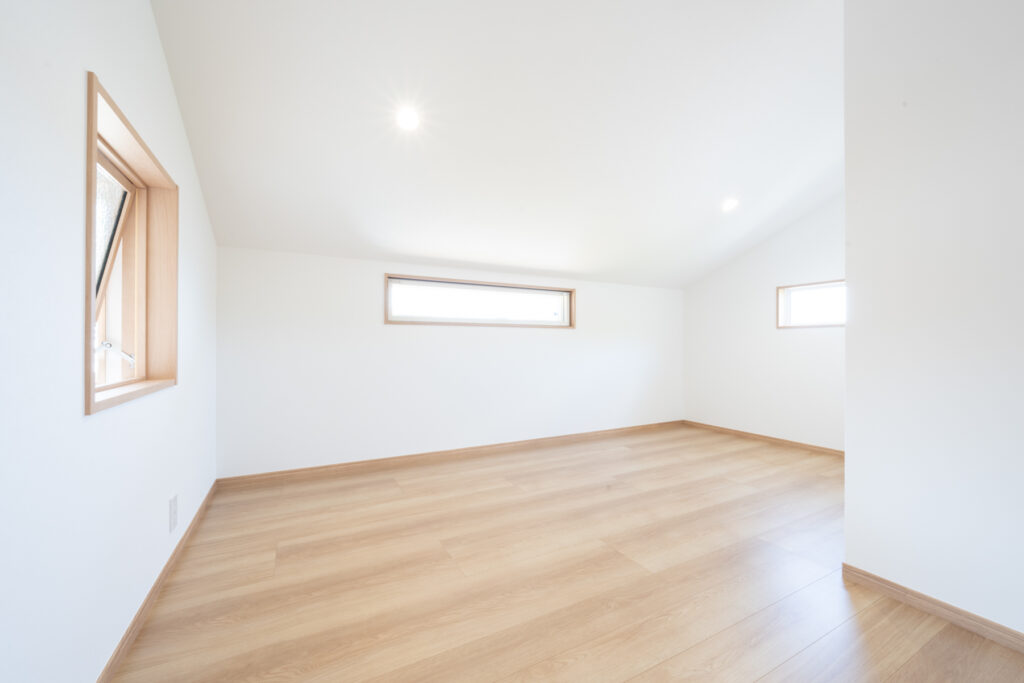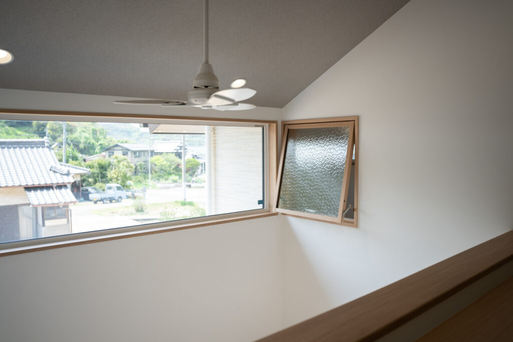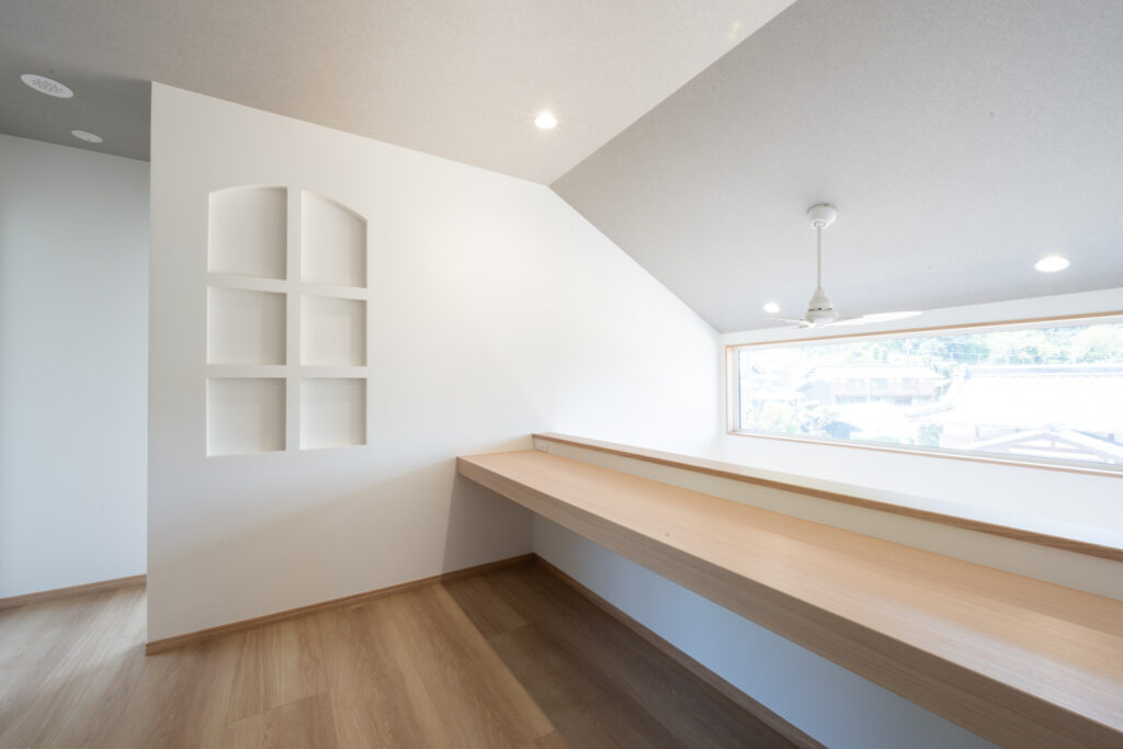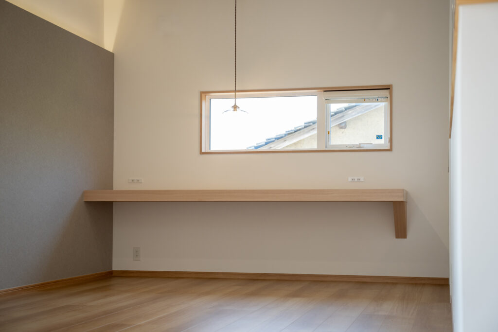 吹き抜け上に広がる2階のマルチスペースは、今は家族みんなの遊び場として、やがては子どもたちそれぞれの居場所として、年月とともに姿を変えていきます。窓のようなニッチが壁に遊び心を添え、季節の光が差し込むたびに、この家で過ごす時間の豊かさが静かに広がります。